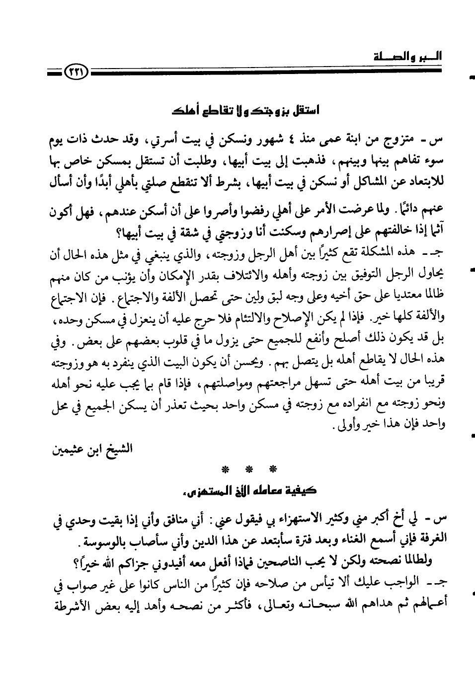 ج- هذه المشكلة تقع كثيراً بين أهل الرجل وزوجته، والذي ينبغي في مثل هذه الحال أن يحاول الرجل التوفيق بين زوجته وأهله والائتلاف بقدر الإمكان وأن يؤنب من كل منهم ظالما معتديا على حق أيه وعلى وجه ليق ولين حتى تحصل الألفة والاجتماع. فإن الاجتماع والألفة كلها خير. فإذا لم يكن الإصلاح والالتئام فلا حرج عليه أن ينعزل في مسكن وحده، بل قد يكون ذلك أصلح وأنفع للجميع حتى يزول ما في قلوب بعضهم على بعض. وفي هذه الحال لا يقاطع أهله بل يتصل بهم. ويحسن أن يكون البيت الذي ينفرد به هو وزوجته قريبا من بيت أهله حتى تسهل مراجعتهم ومواصلتهم، فإذا قام بما يجب عليه نحو أهله ونحو زوجته مع انفراده مع زوجته في مسكن واحد بحيث تعذر أن يسكن الجميع في محل واحد فإن هذا خير وأولى.