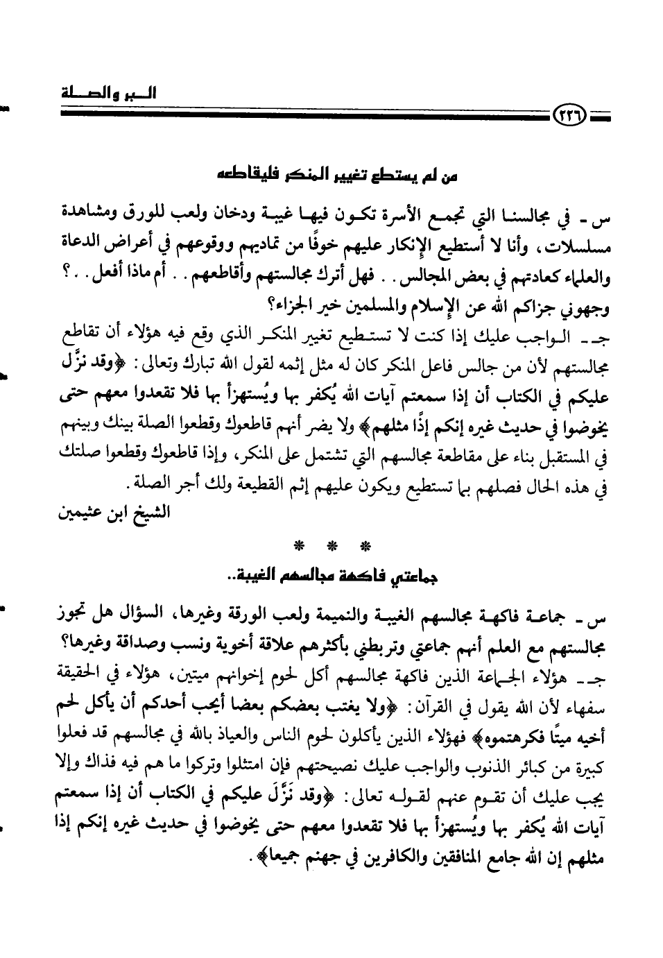 س - جماعةن فاكهة مجالسهم الغيبة والنميمة ولعب الورقة وغيرها، السؤال هل تجوز مجالستهم مع العلم أنهم جماعتي وتربطني بأكثرهم علاقة أخوية ونسب وصداقة وغيرهما؟