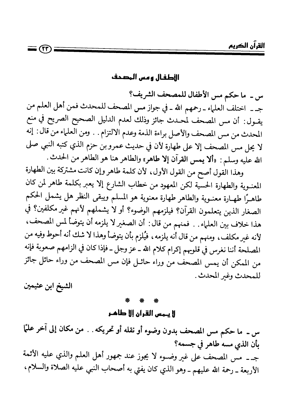 وهذا القول أصح من القول الأول، لأن كلمة طاهر وإن كانت مشتركة بين الطهارة المعنوية والطهارة الحسية لكن المعهود من خطاب الشارع إلا يعبر بكلمة طاهر لمن كان طاهراً طهارة معنوية والطاهر طهارة معنوية هو المسلم ويبقى النظر هل يشمل الحكم الصغار الذي يتعلمون القرآن؟ فيلزمهم الوضوء؟ أو لا يشملهم لأنهم غير مكلفين؟ في هذا خلاف بين العلماء.. فمنهم من قال أن الصغير لا يلزمه أن يتوضأ لمس المصحف، لأنه غير مكلف، ومنهم من قال أنه يلزمه، فيلزم بأن يتوضأ وهذا لا شك أن أحوط وفيه من المصلحة أننا نغرس في قلوبهم إكرام كلام الله - عز وجل - فإذا كان في الزامهم صعوبة فإنه من الممكن أن يمس المصحف من وراء حائل فإن مس المصحف من وراء حائل جائز للمحدث وغير المحدث.