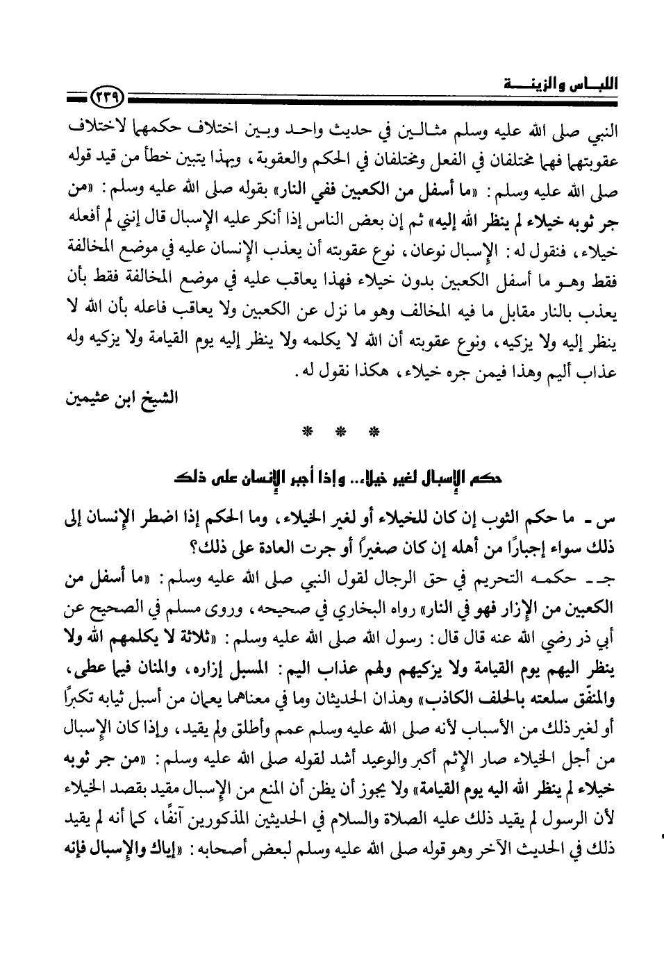 النبي، - صلى الله عليه وسلم -، مثالين في حديث واحد وبين اختلاف حكمهما لاختلاف عقوبتهما فهما مختلفان في الفعل ومختلفان في الحكم والعقوبة، وبهذا يتبين خطأ من قيد قوله، - صلى الله عليه وسلم -، {من أسفل من الكعبين ففي النار} بقوله، - صلى الله عليه وسلم -، {من جر ثوبه خيلاء لم ينظر الله إليه} ثم أن بعض الناس إذا أنكر عليه الإسبال قال إنني لم أفعله خيلاء، فنقول له الإسبال نوعان، نوع عقوبته أن يعذب الإنسان عليه في موضع المخالفة فقط وهو ما أسفل الكعبين بدون خيلاء فهذا يعاقب عليه في موضع المخالفة فقط بأن يعذب بالنار مقابل ما فيه المخالف وهو ما نزل عن الكعبين ولا يعاقب فاعله بأن الله لا ينظر إليه ولا يزكيه، ونوع عقوبته أن الله لا يكلمه ولا ينظر إليه يوم القيامة ولا يزكيه وله عذاب أليم وهذا فيمن جره خيلاء، هكذا نقول له.