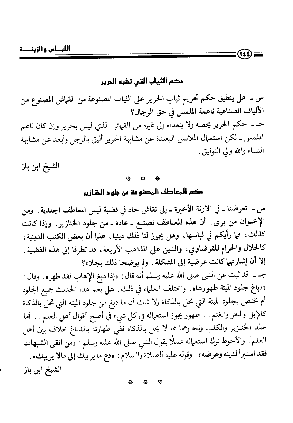 س - تعرضنا - في الآونة الأخيرة - إلى نقاش حاد في قضية لبس المعاطف الجلدية. ومن الإخوان من يرتى أن هذه المعاطف تصنع - عادة - من جلود الخنازير. وإذا كانت كذلك، فما رأيكم في لباسها، وهل يجوز لنا ذلك ديننا، علما أن بعض الكتب الدينية، كالحلال والحرام للقرضاوي، والدين على المذاهب الأربعة، قد تطرقا إلى هذه القضية إلا أن إشارتهما كانت عرضية إلى المشكلة. ولم يوضحا ذلك بجلاء؟