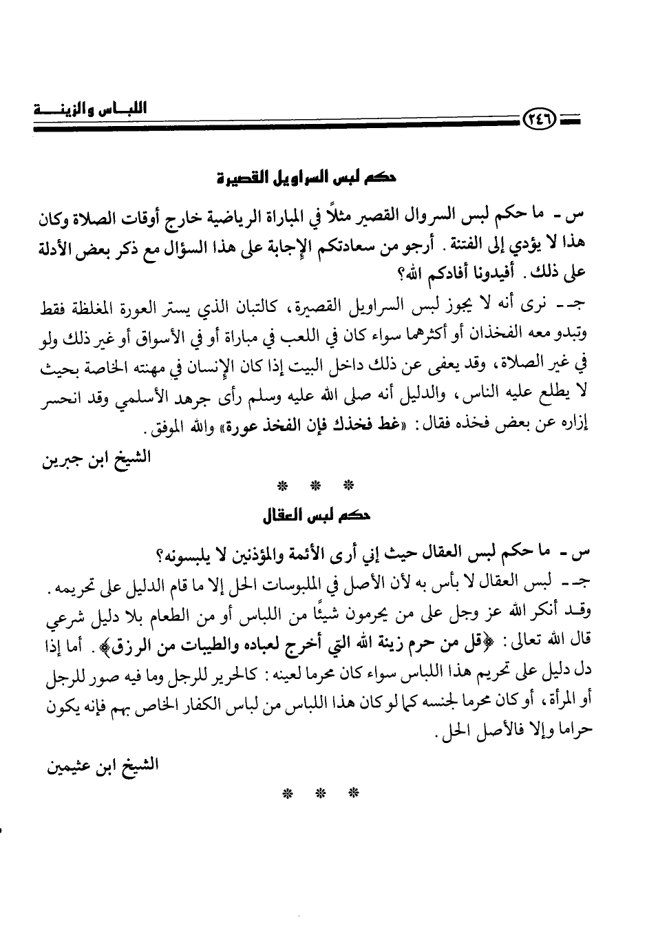 س - ما حكم لبس السروال القصير مثلاً في المبارة الرياضية خارج أوقات الصلاة وكان هذا لا يؤدي إلى الفتنة. أرجو من سعادتكم الإجابة على هذا السؤال مع ذكر بعض الأدلة على ذلك. أفيدوني أفادكم الله؟