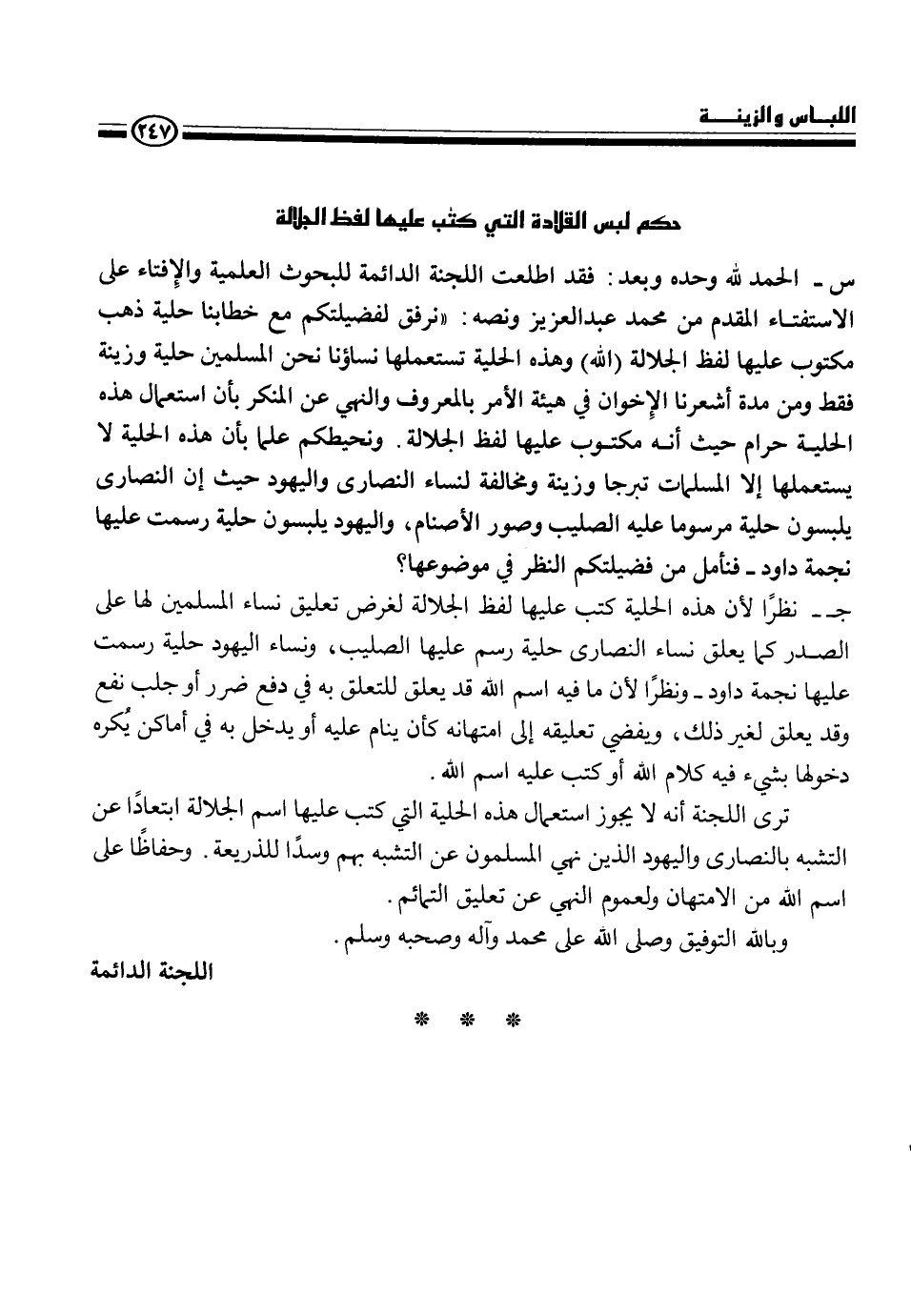 س - الحمد لله وحده وبعد فقد اطلعت اللجنة الدائمة للبحوث العلمية والإفتاء على الاستفتاء المقدم من محمد عبد العزيز ونصه " ترفق نساؤنا لفضيلتكم مع خطابنا حلية ذهب مكتوب عليها لفظ الجلالة (الله) وهذه الحلية تستعملها نساؤنا نحن المسلمين حلية وزينة فقط ومن مدة أشعرنا الإخوان في هيئة الأمر بالمعروف والنهي عن المنكر بأن استعمال هذه الحلية حرام حيث أنه مكتوب عليها لقظ الجلالة. ونحيطكم علما بأن هذه الحلية لا يستعلمها إلا المسلمات تبرجا وزينة ومخالفة لنساء النصارى واليهود حيث أن النصارى يلبسون حلية مرسوما عليه الصليب وصور الأصنام، واليهود يلبسون حلية رسمت عليها نجمة داود - فنأمل من فضيلتكم النظر في موضوعها؟