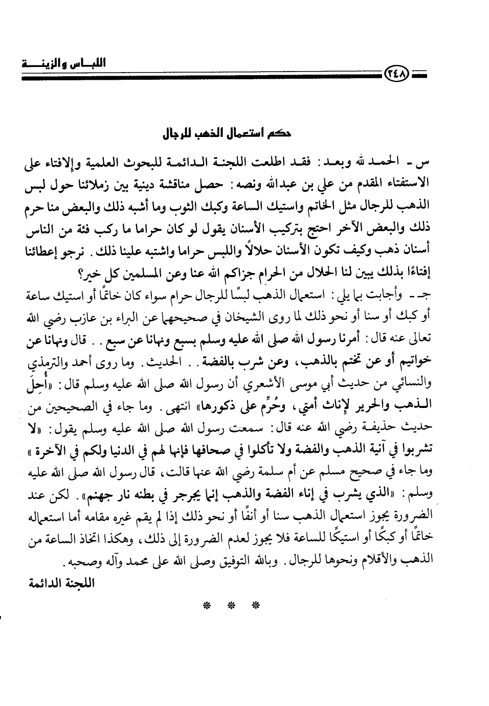 س - الحمد لله وبعد فقد اطلعت اللجنة الدائمة للبحوث العلمية والإفتاء على الاستفتاء المقدم من على بين عبد الله ونصه حصل مناقشة دينية بين زملائنا حول لبس الذهب للرجال مثل الخاتم واستيك الساعة وكبك الثوب وما أشبه ذلك والبعض منا حرم ذلك والبعض الآخر احتج بتركيب الأسنان بيقول لو كان حراما ما ركب فئة من الناس أسنان ذهب وكيف تكون الأسنان حلالاً واللبس حراماً ما ركب فئة من الناس أسنان ذهب وكيف تكون الأسنان حلالاً واللبس حراما واشتهب علينا ذلك. نرجو إعطائنا إفتاءاً بذلك يبين لنا الحلال من الحرام جزاكم الله عنا وعن المسلمين كل خير؟