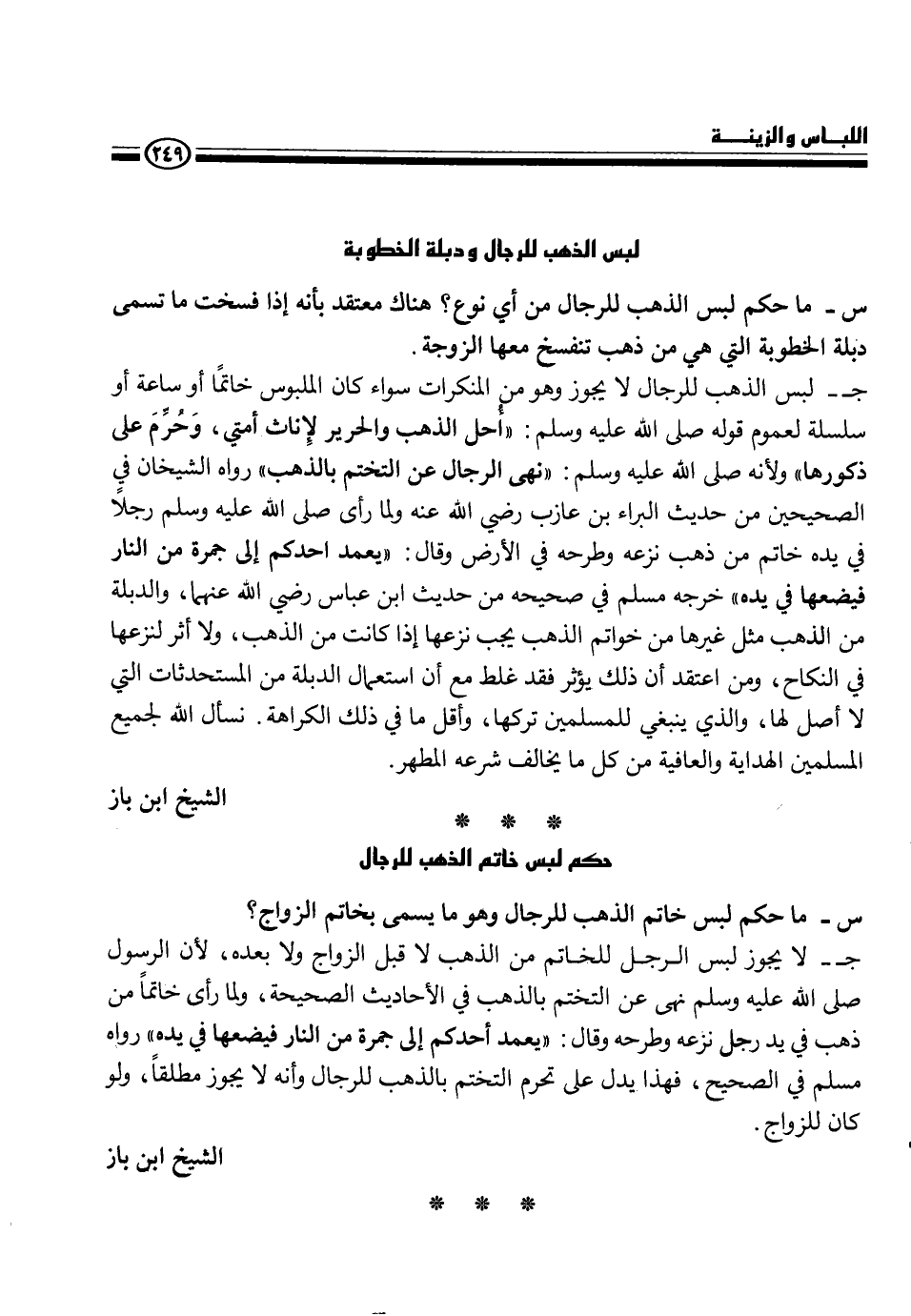 ج- لبس الذهب للرجال لا يجوز وهو من المنكرات سواء كان الملبوس خاتماً أو ساعة أو سلسلة لعموم قوله، - صلى الله عليه وسلم -، {أحل الذهب والحرير لإناث أمتي، وحرم على ذكورها} ولانه صلى الله عليه وسلم {نهى الرجال عن التختم بالذهب} رواه الشيخان في من حديث البراء بن عازب رضي الله عنه ولما رأى صلى الله عليه وسلم رجلاً في يده خاتم من ذهب نزعه وطرحه في الأرض وقال {يعمد أحدكم إلى جمرة من النار فيضعها في يده} خرجه مسلم في صحيحه من حديث ابن عباس رضي الله عنهما، والدبلة من الذهب مثل غيرها من خواتم الذهب يجب نزعها إذا كانت من الذهب، ولا أثر لنزعها في النكاح، ومن اعتقد أن ذلك يؤثر فقد غلط مع أن استعمال الدبلة من المستحدثات التي لا أصل لها، والذي ينبغي للمسلمين تركها، وأقل ما في ذلك الكراهة. نسأل الله لجميع المسلمين الهداية والعافية من كل ما يخالف شرعه المطهر.