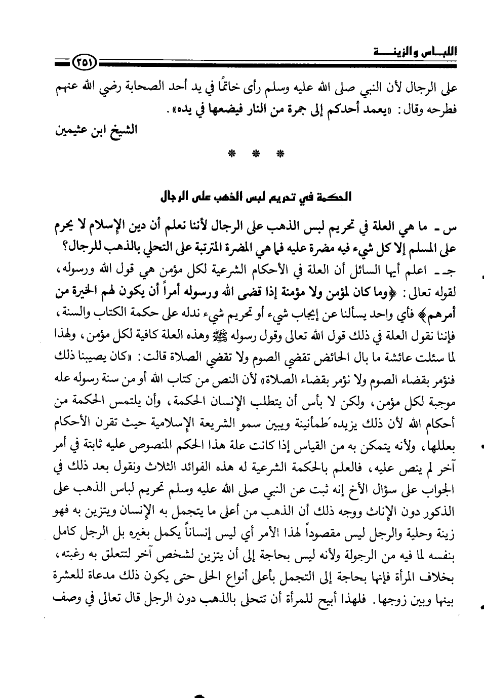 ج- اعلم أيها السائل أن العلة في الأحكام الشرعية لكل مؤمن هي قول الله ورسوله، لقوله تعالى {وما كان لمؤمن ولا مؤمنة إذا قضى الله ورسوله أمراً أن يكون لهم الخيرة من أمرهم} فأي واحد يسألنا عن إيجاب شيء أو تحريم شيء ندله على حكمة الكتاب والسنة، فإننا نقول العلة في ذلك قول الله تعالى وقول رسوله، - صلى الله عليه وسلم -، وهذه العلة كافية لكل مؤمن، ولهذا لما سئلت عائشة ما بال الحائض تقضي الصوم ولا تقضي الصلاة قالت {كان يصيبنا ذلك فنؤمر بقضاء الصوم ولا نؤمر بقضاء الصلاة} لأن النص من كتاب الله أو من سنة رسوله عله، موجبة لكل مؤمن، ولكن لا بأس أن يتطلب الإنسان الحكمة، وأن يلتمس الحكمة من أحكام الله لأن ذلك يزيده طمأنية ويبين سمو الشريعة الإسلامية حيث تقرن الأحكام بعللها، ولأنه يتمكن به من القياس إذا كانت علة هذا الحكم المنصوص عليه ثابتة في أمر آخر لم ينص عليه، فالعلم بالحكمة الشرعية له هذه الفوائد الثلاث ونقول بعد ذلك في الجواب على سؤال الأخ إنه ثبت عن النبي، - صلى الله عليه وسلم -، تحريم لباس الذهب على الذكور دون الإناث ووجه ذلك أن الذهب من أعلى ما يتجمل به الإنسان ويتزين به فهو زينة وحلية والرجل ليس مقصودا ً لهذا الأمر أي ليس إنساناً يكمل بغيره بل الرجل كامل بنفسه لما فيه من الرجولة ولأنه ليس بحاجة إلى أن يتزين لشخص آخر لتتعلق به رغبته، بخلاف المرأة فإنها بحاجة إلى التجمل بأعلى أنواع الحلى حتى يكون ذلك مدعاة للعشرة بينها وبين زوجها، فلهذا أبيح للمرأة أن تتحلى بالذهب دون الرجل قال تعالى في وصف