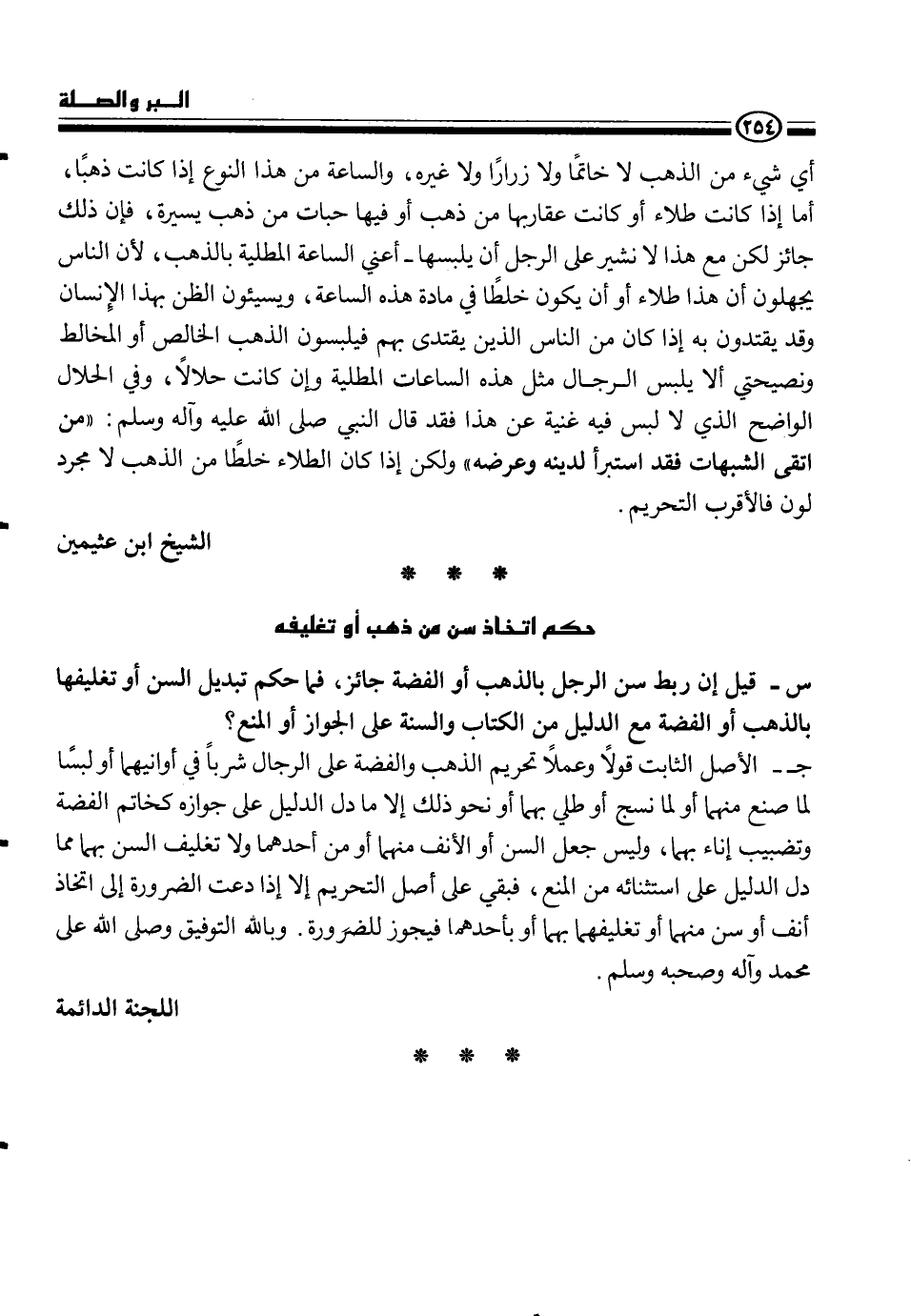 ج- الأصل الثابت قولاً وعملاً تحريم الذهب والفضة على الرجال شرباً في أوانيهما أو لبسا لما صنع منهما أو لما نسج أو طلي بهما أو نحو ذلك إلا ما دل الدليل على جوازه كخاتم الفضة وتضبيب إناء بهما، وليس جعل السن أو الأنف منهما أو من أحدهما ولا تغليف السن بهما مما دل الدليل على استثنائه من المنع، فبقى على أصل التحريم إلا إذا دعت الضرورة إلى اتخاذ أنف أو سن منهما أو تغليفهما بهما أو بأحدهما فيجوز للضرورة. وبالله التوفيق وصلى الله على محمد وآله وصحبه وسلم.