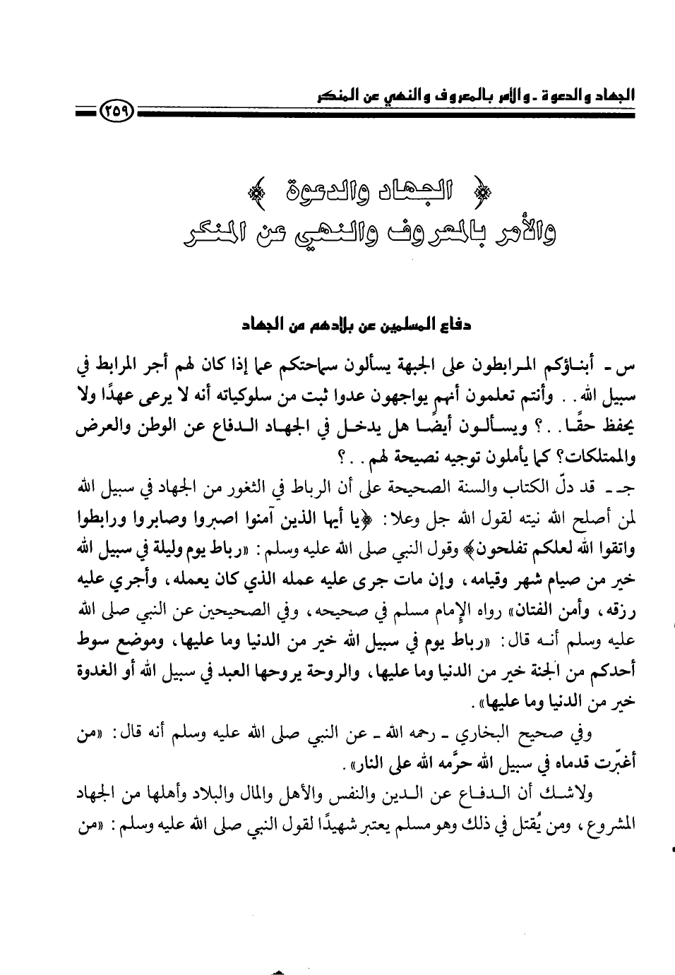 ج- قد دلّ الكتاب والسنة الصحيحة على أن الرباط في الثغور من الجهاد في سبيل الله لمن أصلح الله نيته لقول الله جل وعلا {يا أيها الذين آمنوا اصبروا وصابروا ورابطوا واتقوا الله لعلكم تفلحون} وقول النبي، - صلى الله عليه وسلم -، {رباط يوم وليلة في سبيل الله خير من صيام شهر وقيامه} وإن مات جرى عليه عمله الذي كان يعمله، وأجرى عليه رزقه، وأمن الفتان، رواه الإمام مسلم في صحيحه، وفي الصحيحين عن النبي، - صلى الله عليه وسلم -، أنه قال {رباط يوم في سبيل الله خير من الدنيا وما فيها، وموضع سوط أحدكم من الجنة خير من الدنيا وما عليها، والروحة يروحها العبد في سبيل الله أو الغدوة خير من الدنيا وما عليها} .