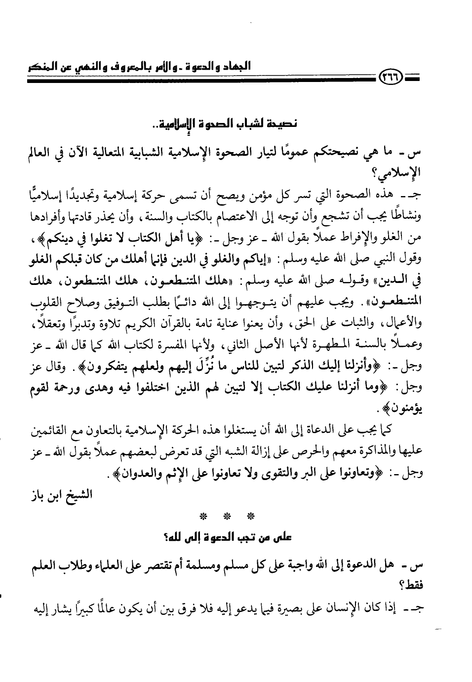 ج- هذه الصحوة التي تسر كل مؤمن ويصح أن تسمى حركة إسلامية وتجديداً إسلامياً ونشاطاً يجب أن تشجع وأن توجه إلى الاعتصام بالكتاب والسنة، وأن يجذر قادتها وأفرادها من الغلو والإفراط عملاً بقول الله - سبحانه وتعالى - {يا أهل الكتاب لا تغلوا في دينكم} ، وقول النبي، - صلى الله عليه وسلم -، {إياكم والغلو في الدين فإنما أهلك من كان قبلكم الغلو في الدين} ، قوله صلى الله عليه وسلم، {هلك المتنطعون، هلك المتنطعون، هلك المتنطعون} . ويجب عليهم أن يتوجهوا إلى الله دائماً بطلب التوفيق وصلاح القلوب والأعمال، والثبات على الحق، وأن يعنوا عناية تامة بالقرآن الكريم تلاوة وتدبراً وتعقلاً، وعملاً بالسنة المطهرة لأنها الأصل الثاني، ولأنها المفسرة لكتاب الله كما قال الله، عز وجل {وأنزلنا إليك الذكر لتبين للناس ما نزل إليهم ولعلكم يتفكرون} . وقال عز وجل {وما أنزل عليك الكتاب إلا لتبين لهم الذين اختلفوا فيه هدى ورحمة لقوم يؤمنون} .
