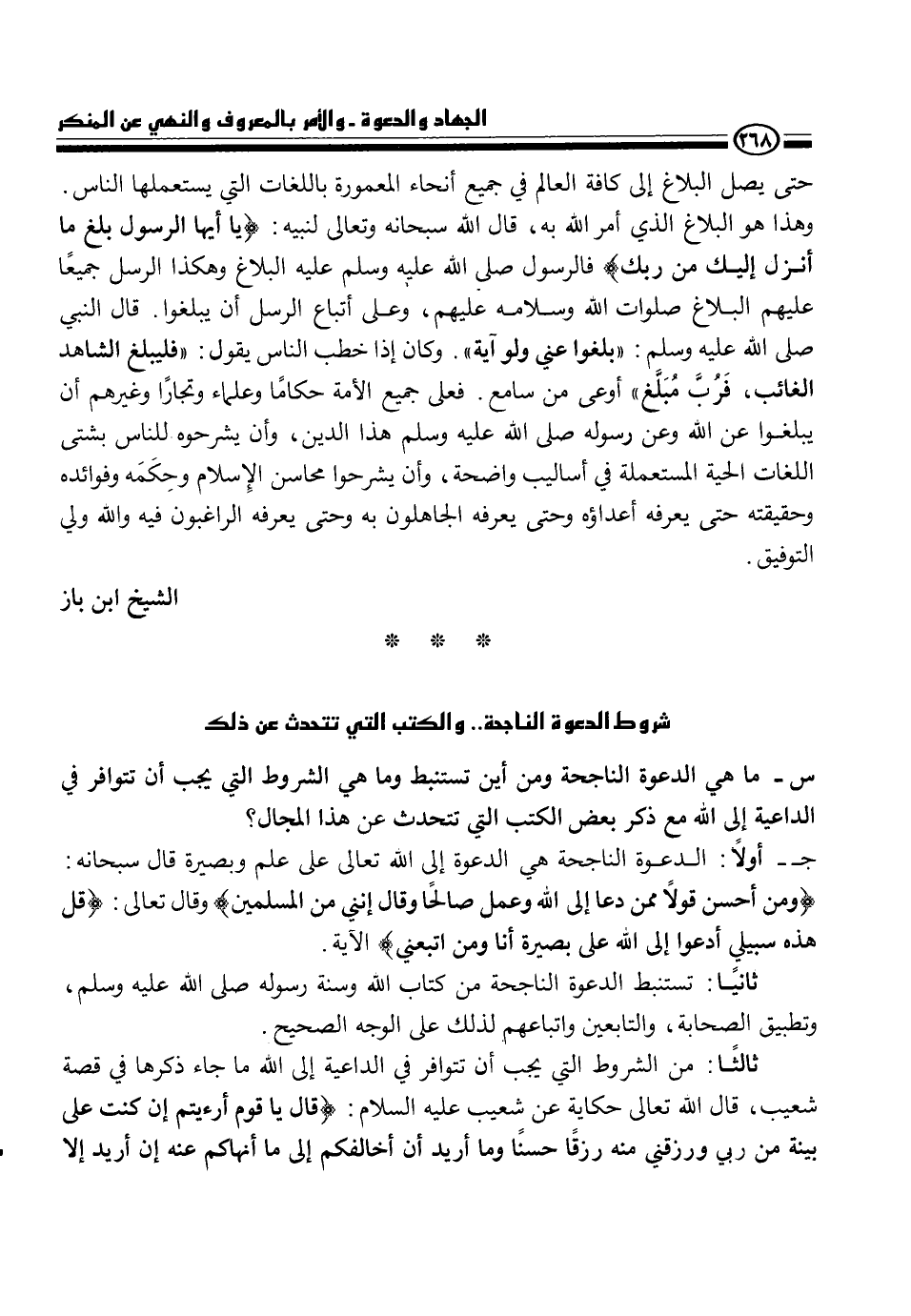 حتى يصل البلاغ إلى كافة العالم في جميع أنحاء المعمورة باللغات التي يستعلمها الناس. وهذا هو البلاغ الذي أمر الله به، قال سبحانه وتعالى لنبيه {يا أيها الرسول بلغ ما أنزل إليك من ربك} فالرسول صلى الله عليه وسلم عليه البلاغ وهكذا الرسل جميعاً عليهم البلاغ صلوات الله وسلامة عليهم، وعلى أتباع الرسل أن يبلغوا. قال النبي، - صلى الله عليه وسلم -، {بلغوا عني ولو آية} ، وكان إذا خطب الناس يقول {فليبلغ الشاهد الغائب، قرب مبلغ} أوعى من سامع. فعلى جميع الأمة حكاماً وعلماء وتجاراً وغيرهم أن يبلغوا عن الله وعن رسوله، - صلى الله عليه وسلم -، هذا الدين، وأن يشرحوه للناس بشتى اللغات الحية المستعملة في أساليب واضحة، وأن يشرحوا محاسن الإسلام وحكمه وفوائده وحقيقته حتى يعرفه أعداؤه وحتى يعرفه الجاهلون به وحتى يعرفه الراغبون فيه والله ولي التوفيق.