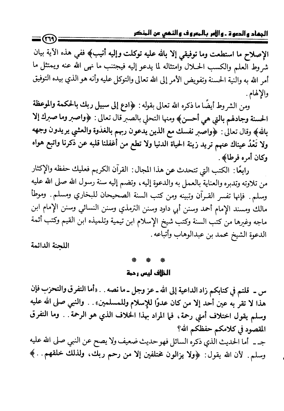 س - قلتم في كتابكم زاد الداعية إلى الله - عز وجل - ما نصه.. {أما التفرق والتحزب فإن هذا لا تقر به عين أحد إلا من كان عدواً للإسلام وللمسلمين} .. والنبي، - صلى الله عليه وسلم -، يقول اختلاف أمتي رحمة، فما المراد بهذا الخلاف هو الرحمة.. وما التفرق المقصود في كلامكم حفظكم الله؟