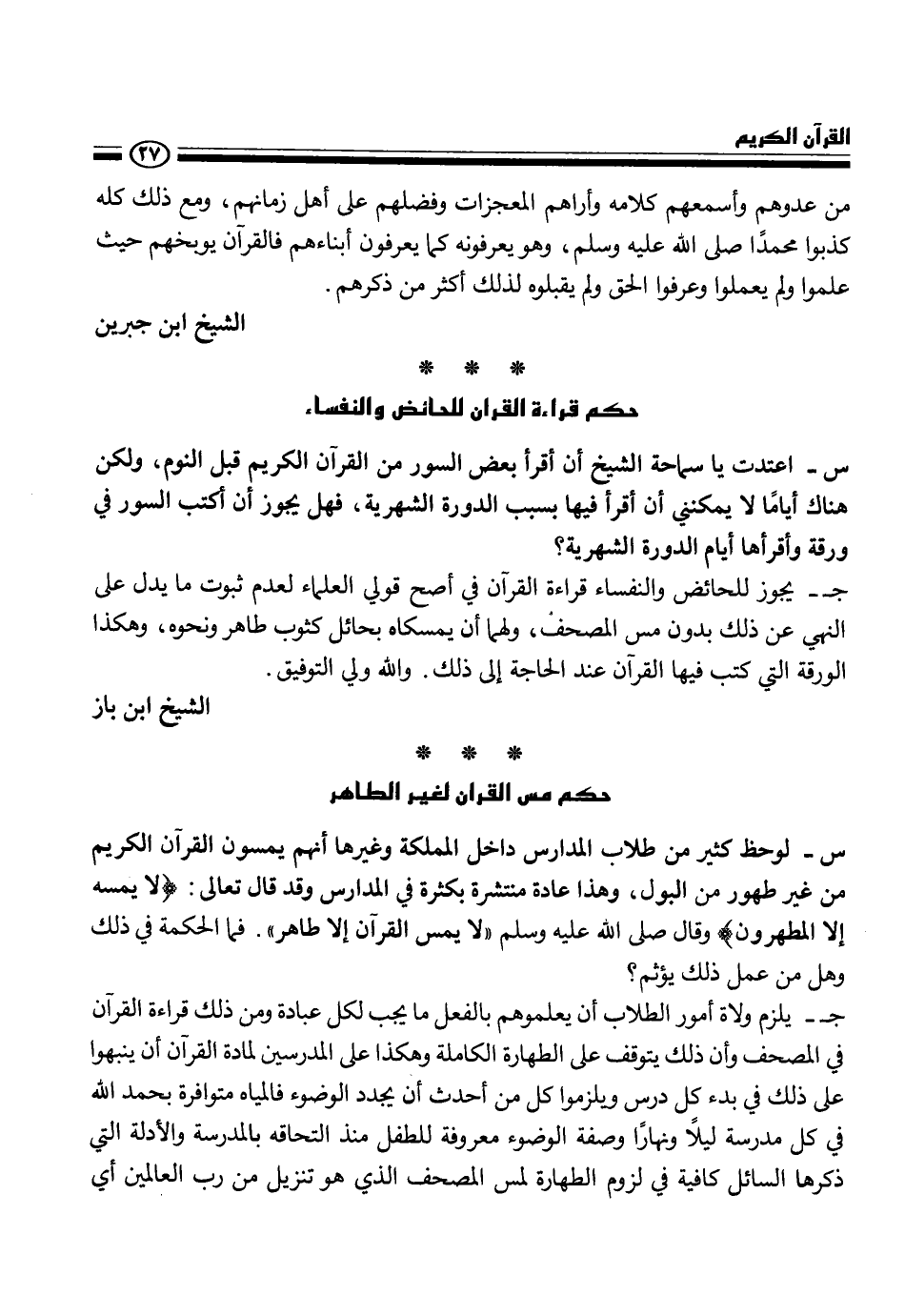 ج- يجوز للحائض والنفساء قراءة القرآن في أصح قولي العلماء لعدم ثبوت ما يدل على النهي عن ذلك بدون مس المصحف، ولهما أن يمسكاه بحائل كثوب طاهر ونحوه، وهكذا الورقة التي كتب فيها القرآن عند الحاجة إلى ذلك، والله ولي التوفيق.