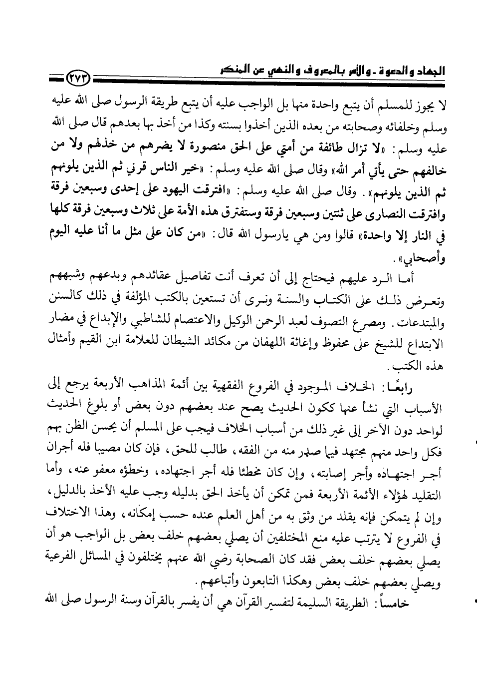 لا يجوز للمسلم أن يتبع واحدة منها بل الواجب عليه أن يتبع طريقة الرسول، - صلى الله عليه وسلم -، وخلفائه وصحابته من بعده الذين أخذوا بسنته وكذا من أخذ بها بعدهم قال صلى الله عليه وسلم {لا تزال طائفة من أمتي على الحق منصورة لا يضرهم من خذلهم ولا من خالفهم حتى يأتي أمر الله} وقال، - صلى الله عليه وسلم -، {خير الناس قرني ثم الذين يلونهم ثم الذين يلونهم} وقال صلى الله عليه وسلم {افترقت اليهود على إحدى وسبعين فرقة وافترقت النصارى على ثنين وسبعين فرقة وسنفترق هذه الأمة على ثلاثة وسبعين فرقة كلها في النار إلا واحدة " قال ومن هي يا رسول الله قال " من كان على مثل ما أنا عليه اليوم وأصحابي} .