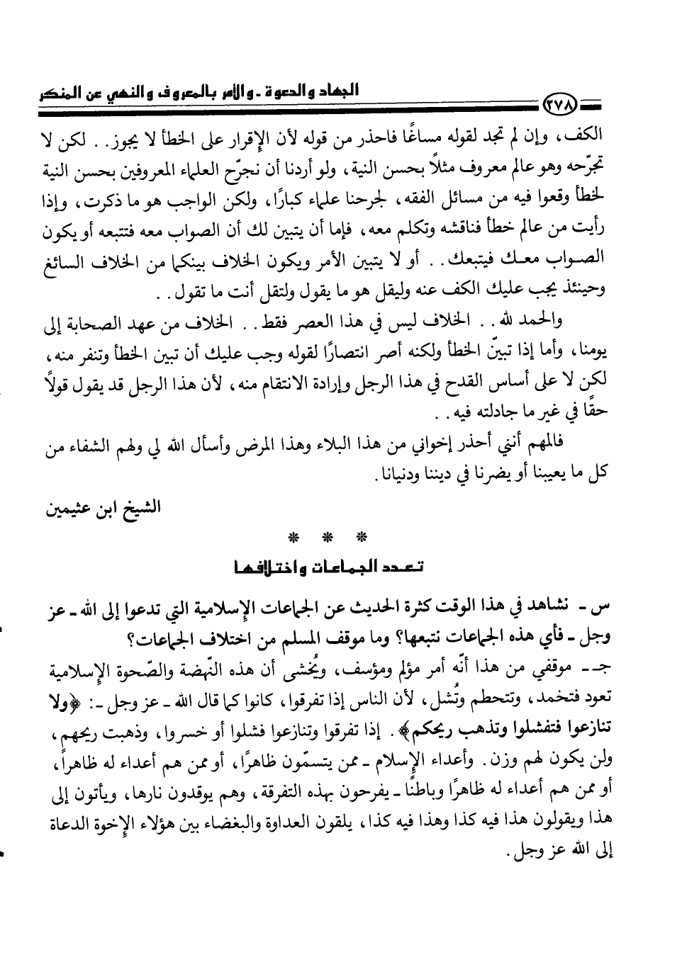 س - نشاهد في هذا الوقت كثرة الحديث عن الجماعات الإسلامية التي تدعو إلى اله - عز وجل - فأي هذه الجماعات نتبعها؟ وما موقف المسلم من اختلاف الجماعات؟