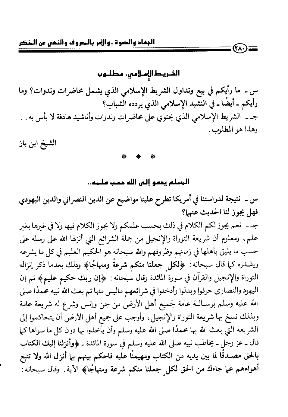 ج- نعم يجوز لكم الكلام في ذلك بحسب علمكم ولا يجوز الكلام فيها ولا في غيرها بغير علم، ومعلوم أن شريعة التوارة والإنجيل من جملة الشرائع التي أنزلها الله على رسله على حسب ما يليق بأهلها في زمانهم وظروفهم والله سبحانه هو الحكيم العليم في كل ما يشرعه وبقدره كما قال سبحانه {لكل جعلنا منكم شرعة ومنهاجاً} وذلك بعدما ذكر إنزاله التوراة والإنجيل والقرآن في سورة المائدة وقال سبحانه {إن ربك حكيم عليم} ثم إن اليهود والنصارى حرفوا وبدلوا وأدخلوا في شرائعهم ما ليس منها ثم بعث الله نبيه محمداً صلى الله عليه وسلم برسالة عامة لجميع أهل الأرض من جن وإنس وشرع له شريعة عامة وبذلك نسخ بها شريعة التوراة والإنجيل، وأوجب على جميع أهل الأرض أن يتحاكموا إلى الشريعة التي بعث الله بها محمد، - صلى الله عليه وسلم -، وأن يأخذوا بها دون كل ما سواها كما قال - عز وجل - يخاطب نبيه، - صلى الله عليه وسلم -، في سورة المائدة {وأنزلنا إليك الكتاب بالحق مصدقاً لما بين يديه من الكتاب ومهيمناً عليه فاحكم بينهم بما أنزل الله ولا تتبع أهواءهم عما جاءك من الحق لكلٍ جعلنا منكم شرعة ومنهاجاً} الآية. وقال سبحانه