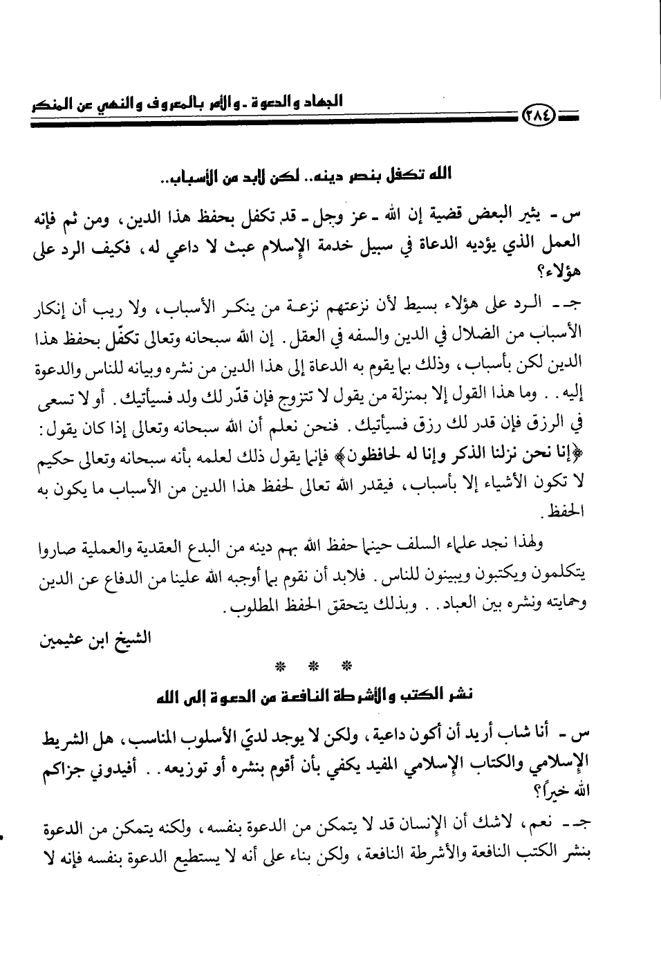 ج- الرد على هؤلاء بسيط لأن نزعتهم نزعة من ينكر الأسباب، ولا ريب أن إنكار الأسباب من الضلال في الدين والسفه في العقل، إن الله سبحانه وتعالى تكفل بحفظ هذا الدين لكن بأسباب، وذلك بما يقوم به الدعاة إلى هذا الدين من نشره وبيانه للناس والدعوة إليه.. وما هذا القول إلا بمنزلة من يقول لا تتزوج فإن قدر لك ولد فسيأتيك. أولا تسعى في الرزق فإن قدر لك رزق فسيأتيك. فنحن نعلم أن الله سبحانه وتعالى إذا كان يقول {إنا نحن نزلنا الذكر وإنا له لحافظون} فإنما يقول ذلك لعلمه بأنه سبحانه وتعالى حيكم لا تكون الأشياء إلا بأسباب، فيقدر الله تعالى لحفظ هذا الدين من الأسباب ما يكون به الحفظ.