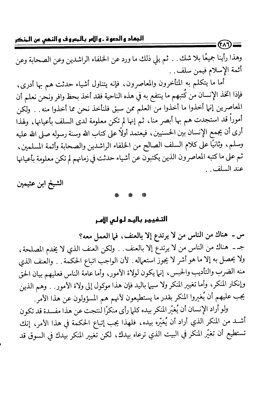ولو أراد الإنسان أن يغير المنكر بيده كلما رأيى منكراً لنتجت عن هذا مفسدة قد تكون أشد من المنكر الذي أراد أن يغيره بيده، فلهذا يجب إتباع الحكمة في هذا الأمر، إنك تستطيع أن تغير المنكر في البيت الذي ترعاه بيدك، لكن تغير المنكر بيدك في السوق قد