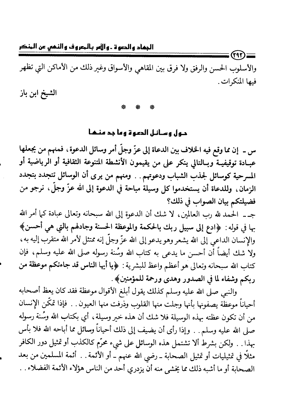 والنبي، - صلى الله عليه وسلم -، كذلك يقول أبلغ الأقوال موعظة فقد كان يعظ أصحابه أحياناً موعظة يصفونها بأنها وجلت منها القلوب وذرقت منها العيون.. فإذا تمكن الإنسان من أن تكون عظته بهذه الوسيلة فلا شك أن هذه خير وسيلة، أي كتاب الله وسنة رسوله، - صلى الله عليه وسلم -.. وإذا رأي أن يضيف إلى ذلك أحياناً وسائل مما أباحه الله فلا بأس بهذه.. ولكن بشرط ألا تشتمل هذه الوسائل على شيء محرم كالكذب أو تمثيل دور الكافر مثلاً في تمثيليات أو تمثيل الصحابة - رضي الله عنهم - أو الأئمة.. أئمة المسلمين من بعد الصحابة او ما أشبه ذلك مما يخشى منه أن يزدري أحد من الناس هؤلاء الأئمة الفضلاء..