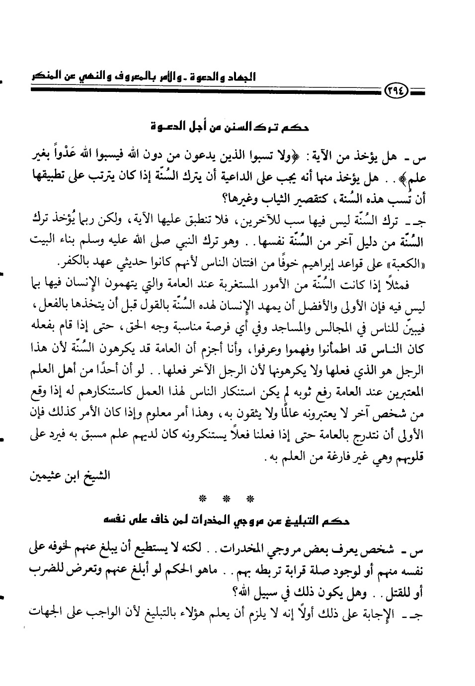 ج- ترك السنة ليس فيه سب للآخرين، فلا تنطبق عليها الآية، ولكن ربما يؤخذ ترك السنة من دليل آخر من السنة نفسها.. وهو ترك النبي، - صلى الله عليه وسلم -، بناء البيت " الكعبة " على قواعد إبراهيم خوفاً من افتتان الناس لأنهم كانوا حديثي عهد بالكفر.