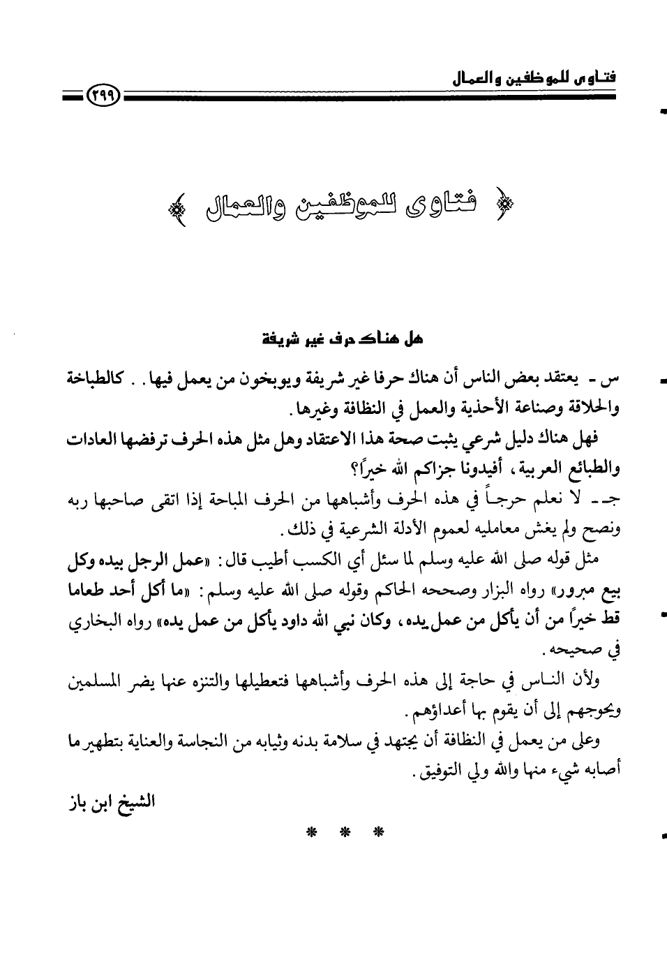 س - يعتقد بعض الناس أن هناك حرف غير شريفة ويوبخون من يعمل بها.. كالطباخة والحلاقة وصناعة الأحذية والعمل في النظافة وغيرها.