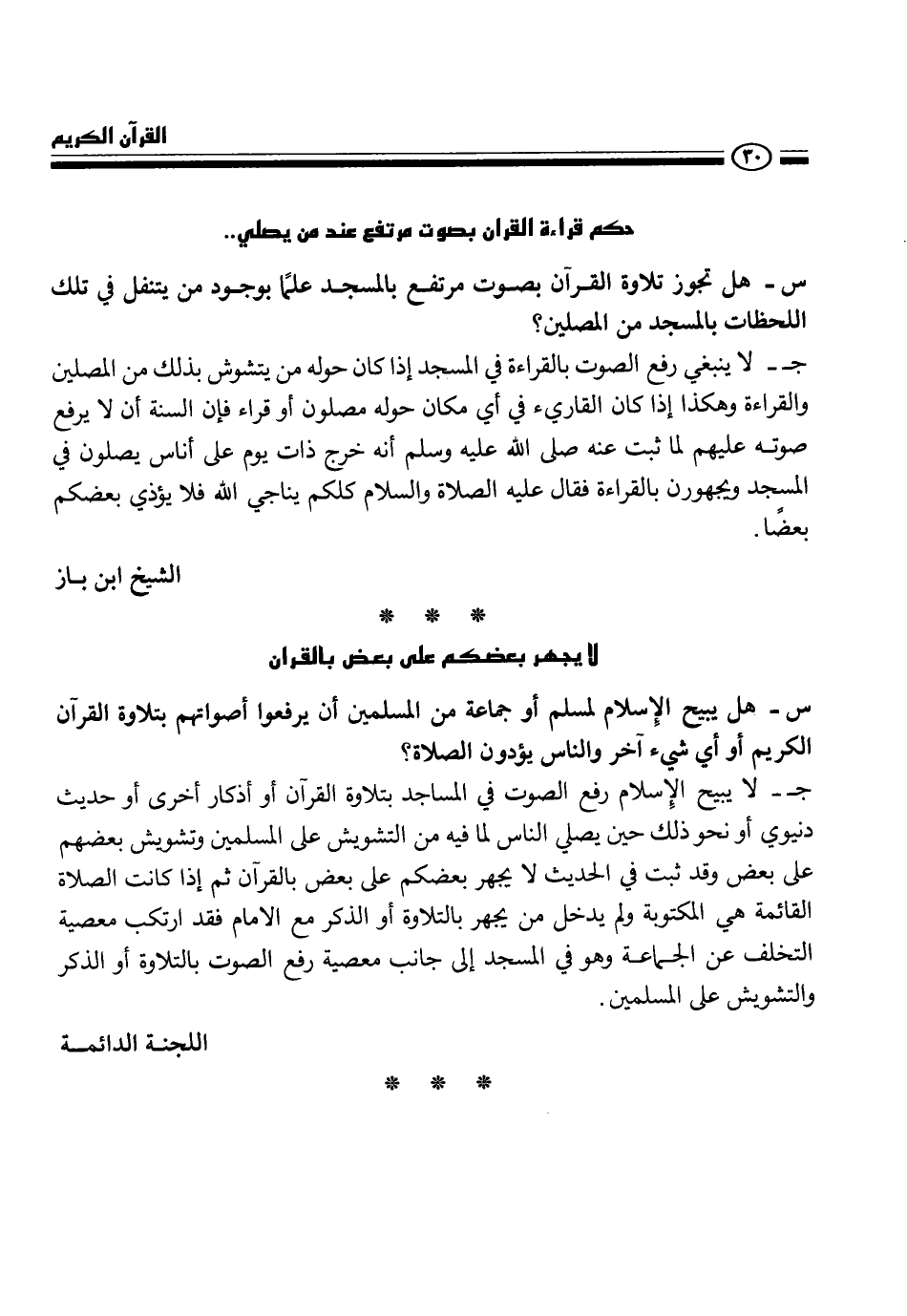 س - هل يبيح الإسلام لمسلم أو جماعة من المسلمين أن يرفعوا أصواتهم بتلاوة القرآن الكريم أو أي شيء آخر والناس يؤدون الصلاة؟