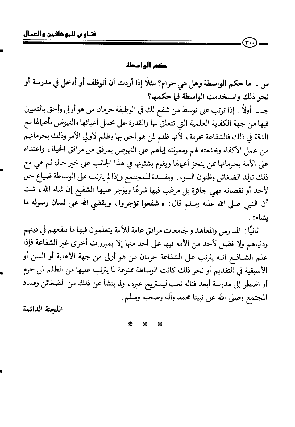 ج- أولا إذا ترتب على توسط من شفع لك في الوظيفة حرمان من هو أولى وأحق بالتعيين فيها من جهة الكفاية العلمية التي تتعلق بها والقدرة على تحمل أعبائها والنهوض بأعمالها مع الدقة في ذلك فالشفاعة محرمة، لأنها ظلم لمن هو أحق بها وظلم لأولي الأمر وذلك بحرمانها من عمل الأكفاء وخدمته لهم ومعونته إياهم على النهوض بمرفق من مرافق الحياة، واعتداء على الأمة بحرمانها ممن ينجز أعمالها ويقوم بشئونها في هذا الجانب على خير حال ثم هي مع ذلك تولد الضغائن وظنون السوء، ومفسدة للمجتمع وإذا لم يترتب على الوساطة ضياع حق لأحد أو نقصانه فهي جائزة بل مرغب فيها شرعاً ويؤجر عليها الشفيع إن شاء الله، ثبت أن النبي، - صلى الله عليه وسلم -، قال {اشفعوا تؤجروا، ويقضي الله على لسان رسوله ما يشاء} .