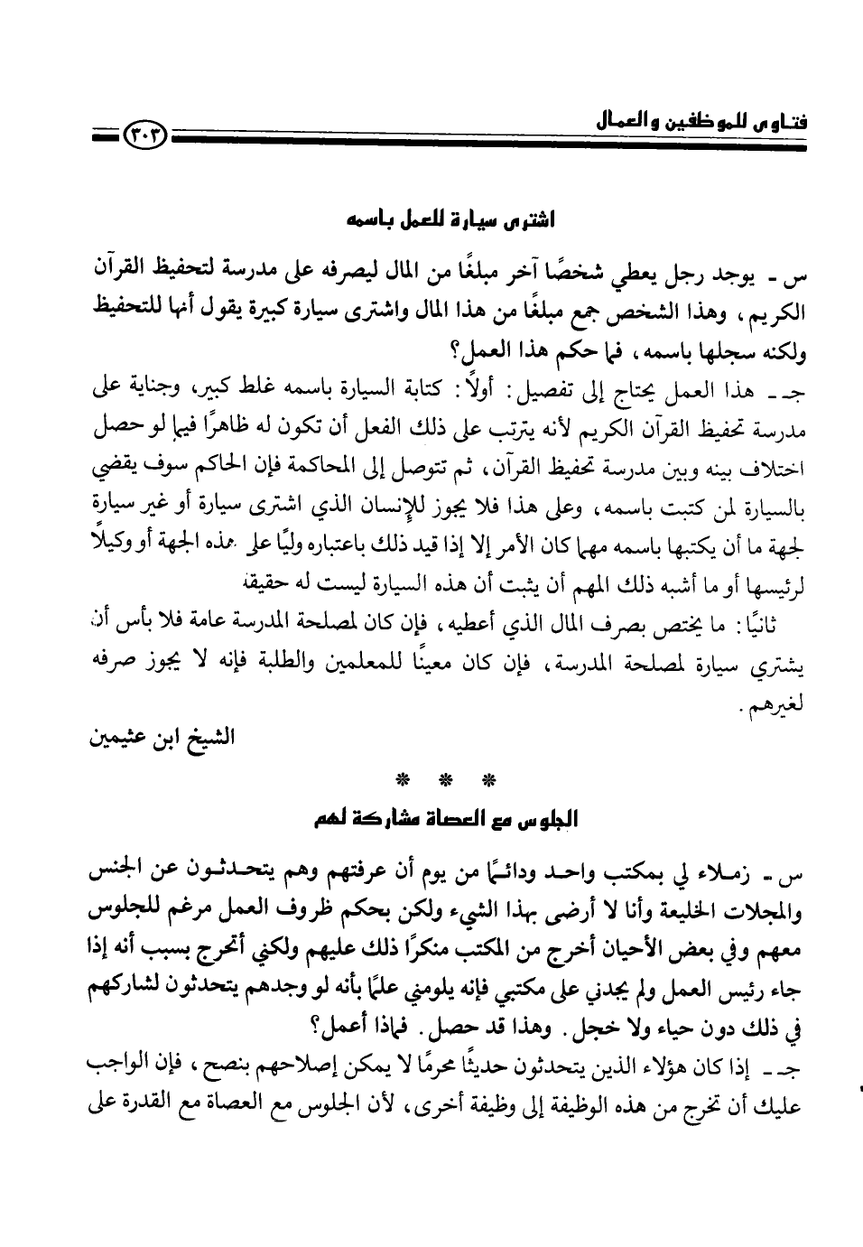 ج- هذا العمل يحتاج إلى تفصيل أولا كتابة السيارة باسمه غلط كبير، وجناية على مدرسة تحفيظ القرآن الكريم لأنه يترتب على ذلك الفعل أن تكون له ظاهراً فيما لو حصل اختلاف بينه وبين مدرسة تحفيظ القرآن، ثم تتوصل إلى المحكمة فإن الحكم سوف يقضي بالسيارة لمن كتب باسمه، وعلى هذا فلا يجوز للإنسان الذي اشتري سيارة أو غير سيارة لجهة ما أن يكتبها باسمه مهما كان الأمر إلا إذا قيد ذلك باعتباره وليا على هذه الجهة أو وكيلاً لرئيسها أو ما أشبه ذلك المهم أن يثبت أن هذه السيارة ليست له حقيقة.