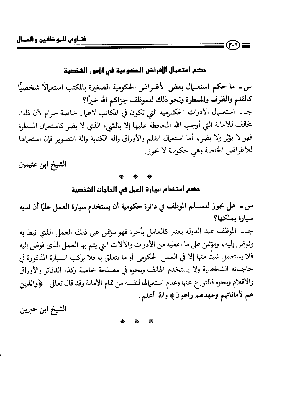 ج- الموظف عند الدولة يعتبر كالعامل بالأجرة فهو مؤتمن على ذلك العمل الذي نيط به وفوض إليه، ومؤتمن على ما أعطيه من الأدوات والآلات التي يتم بها العمل الذي فوض إليه فلا يستعمل شيئاً منها إلا في العمل الحكومي أو ما يتعلق به فلا يركب فلا يركب السيارة المذكورة في حاجاته الشخصية ولا يستخدم الهاتف ونحوه في مصلحة خاصة وكذا الدفاتر والأوراق والأقلام ونحوه فالتورع عنها وعدم استعمالها لنفسه من تمام وقد قال تعالى {والذين هم لأماناتهم وعهدهم راعون} والله أعلم.