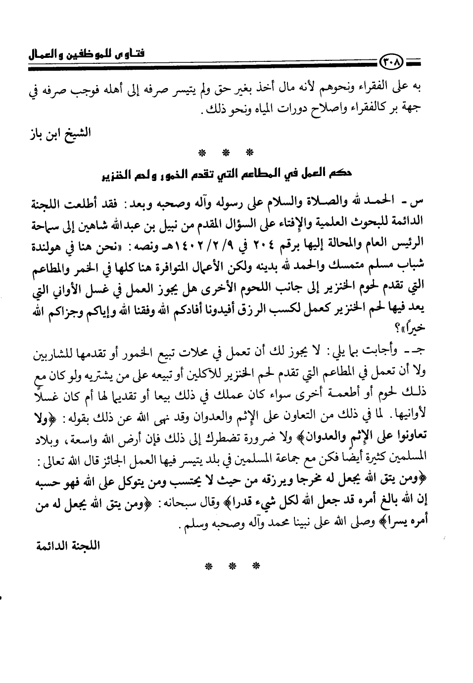 س - الحمد لله والصلاة والسلام على رسوله وآله وصحبه وبعد فقد اطلعت اللجنة الدائمة للبحوث العلمية والإفتاء على السؤال المقدم من نبيل بن عبد الله شاهين إلى سماحة الرئيس العام والمحالة إليها برقم 204 في 9 2 1402 هـ ونصه " نحن هنا في هولندا شباب مسلم متمسك والحمد لله بدينة ولكن الأعمال المتوافرة هنا كلها في الخمر والمطاعم التي تقدم لحوم الخنزير إلى جانب اللحوم الأخرى هل يجوز العمل في غسل الأواني التي يعد فيها لحم الخنزير كعمل لكسب الرزق أفيدونا أفادكم الله وفقنا الله وإياكم وجزاكم الله خيراً "؟