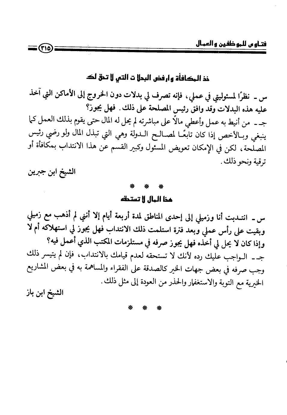 ج- من أنيط به عمل وأعطى مالاً على مباشرته لم يحل له المال حتى يقوم بذلك العمل كما ينبغي وبالأخص إذا كان تابعاً لمصالح الدولة وهي التي تبذل المال ولو رضي رئيس المصلحة، لكن في الإماكن تعويض المسئول وكبير القسم عن هذا الانتداب بمكافأة أو ترقية ونحو ذلك.