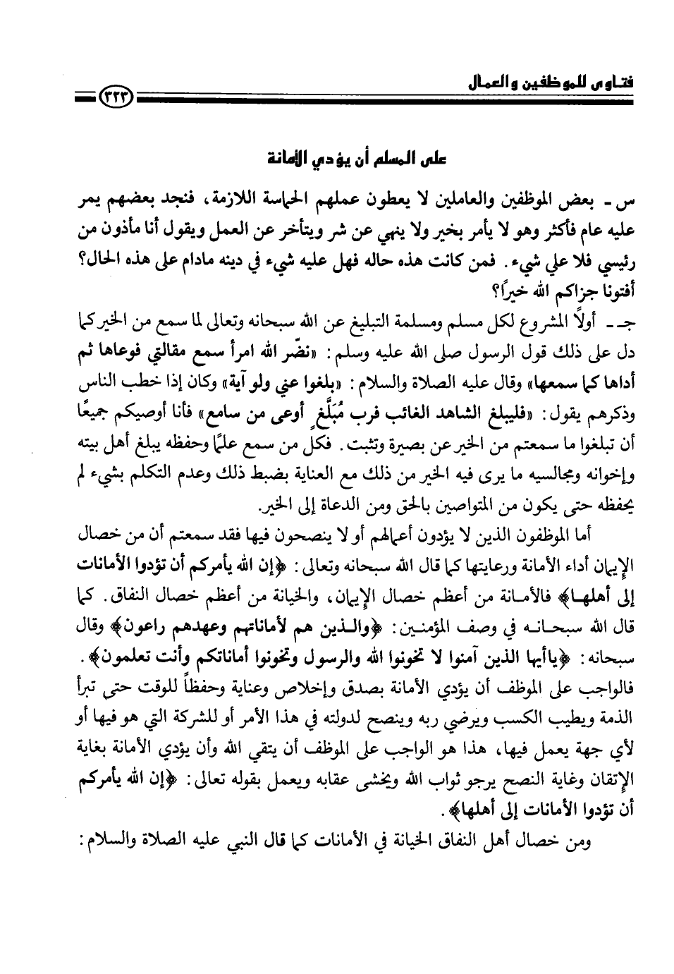 فالواجب على الموظف أن يؤدي الأمانة بصدق وإخلاص وعناية وحفظاً للوقت حتى تبرأ الذمة ويطيب الكسب ويرضي ربه وينصح لدولته في هذا الأمر أو للشركة التي هو فيها أو لأي جهة يعمل فيها، هذا هو الواجب على الموظف أن يتقي الله وأن يؤدي الأمانة بغاية الإتقان وغاية النصح يرجو ثواب الله ويخشى عقابه ويعمل بقوله تعالى {إن الله يأمركم أن تؤدوا الأمانات إلى أهلها} .