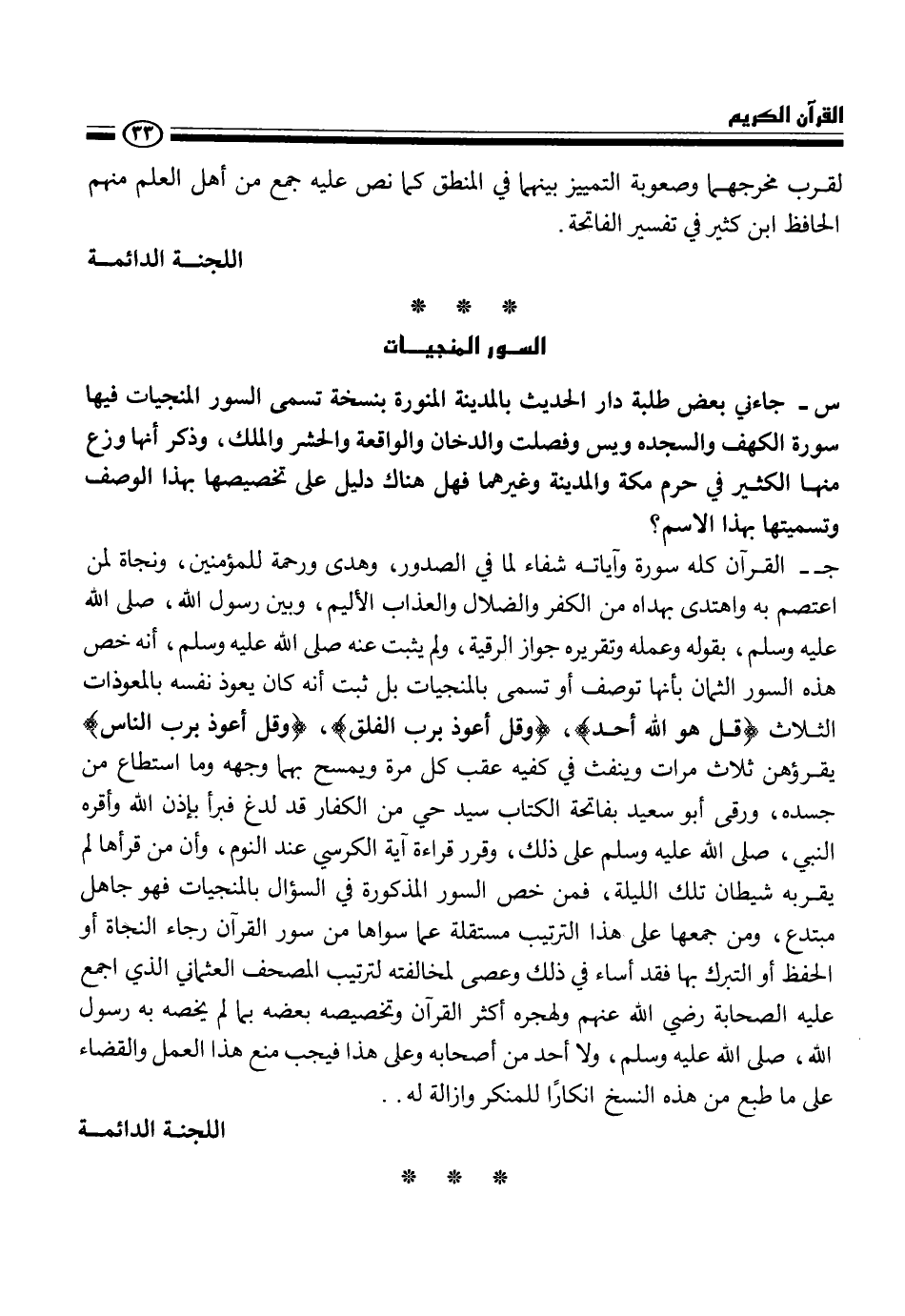 ج- القرآن كله سورة وآياته شفاء لما في الصدور، وهدى ورحمة للمؤمنين، ونجاة لمن اعتصم به واهتدى بهداه من الكفر والضلال والعذاب الأليم، وبين رسول الله، - صلى الله عليه وسلم -، بقوله وعمله وتقريره جواز الرقية، ولم يثبت عنه، - صلى الله عليه وسلم -، أنه خص هذه السور الثمان بأنها توصف أو تسمى بالمنجيات بل ثبت أنه كان يعوذ نفسه بالمعوذات الثلاث {قل هو الله أحد} ، {وقل أعوذ برب الفلق} ، {وقل أعوذ برب الناس} يقرؤهن ثلاث مرات وينفث في كفيه عقب كل مرة ويمسح بها وجهه وما استطاع من جسده، ورقى أبو سعيد بفاتحة الكتاب سيد حي من الكفار قد لدغ فبرأ بإذن الله وأقره النبي، - صلى الله عليه وسلم -، على ذلك، وقرر قراءة آية الكرسي عند النوم، وأن من قرأها لم يقربه شيطان تلك الليلة، فمن خص السور المذكورة في السؤال بالمنجيات فهو جاهل مبتدع، ومن جمعها على هذا الترتيب مستقلة عما سواها من سور القرآن رجاء النجاة أو الحفظ أو التبرك بها فقد أساء في ذلك وعصى لمخالفته لترتيب المصحف العثماني الذي أجمع عليه الصحابة رضي الله عنهم ولهجره أكثر القرآن وتخصيصه بعضه بما لم يخصه به رسول الله، - صلى الله عليه وسلم -، ولا أحد من أصحابه وعلى هذا فيجب منع هذا العمل والقضاء على ما طبع من هذه النسخ انكاراً للمنكر وإزالة له.