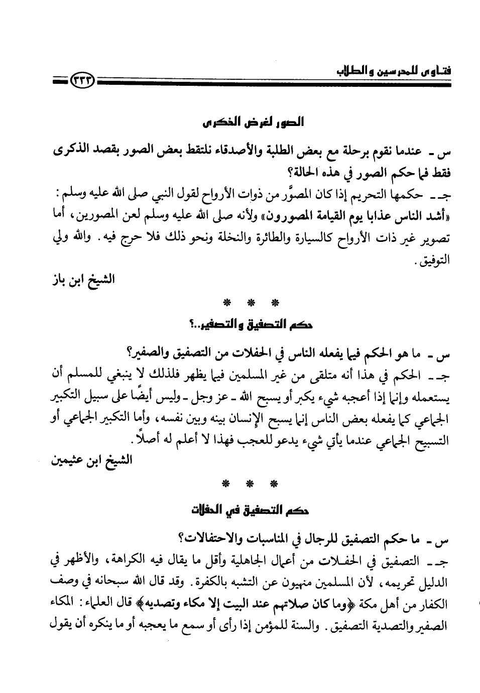 ج- التصفيق في الحفلات من أعمال الجاهلية وأقل ما يقال فيه الكراهة، والأظهر في الدليل تحريمه، لأن المسلمين منهيون عن التشبه بالكفرة. وقد قال سبحانه في وصف الكفار من أهل مكة {وما كان صلاتهم عند البيت إلا مكاء وتصديه} قال العلماء المكاء الصفير والتصدية التصفيق. والسنة للمؤمن إذا رأي أو سمع ما يعجبه أو ما ينكره أن يقول
