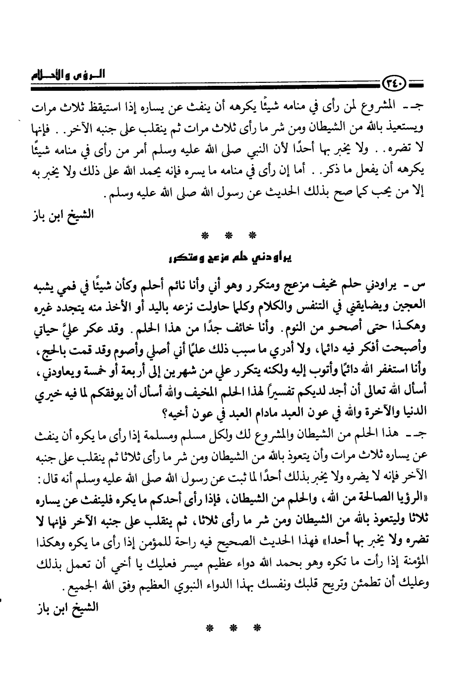 ج- هذا الحلم من الشيطان والمشروع لك ولكل مسلم ومسلمة إذا رأى ما يكره أن ينفث عن يساره ثلاث مرات وأن يتعوذ بالله من الشيطان ومن شر ما رأى ثلاثا ثم ينقلب على جنبه الآخر فإنه لا يضره ولا يخبر بذلك أحداً لما ثبت عن النبي، - صلى الله عليه وسلم -، أنه قال {الرؤيا من الله، والحلم من الشيطان، فإذا رأي أحدكم ما يكره فلينفث عن يساره ثلاثا وليتعوذ بالله من الشيطان ومن شر ما رأى ثلاثاً، ثم انقلب على جنبه الآخر فإنها لا تضره ولا يخبر بها أحداً} فهذا الحديث الصحيح فيه راحة للمؤمن إذا راى ما يكره وهكذا المؤمنة إذا رأت ما تكره وهو بحمد الله دواء عظيم ميسر فعليك يا أخي أن تعمل بذلك وعليك أن تطمئن وتربح قلبك ونفسك بهذا الدواء النبوي العظيم وفق الله الجميع.