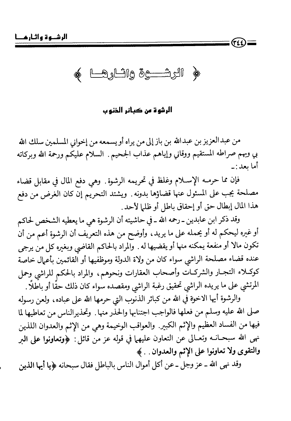 والرشوة أيها الأخوة في الله من كبائر الذنوب التي حرمها الله على عباده، ولعن رسوله، - صلى الله عليه وسلم -، من فعلها فالواجب اجتنابها والحذر منها. وتحذير الناس من تعاطيها لما فيها من الفساد العظيم والإثم الكبير. والعواقب الوخيمة وهي من الإثم والعدوان اللذين نهى الله سبحانه وتعالى عن التعاون عليهما في قوله عز من قائل {وتعاونوا على البر والتقوى ولا تعاونوا على الإثم والعدوان} .