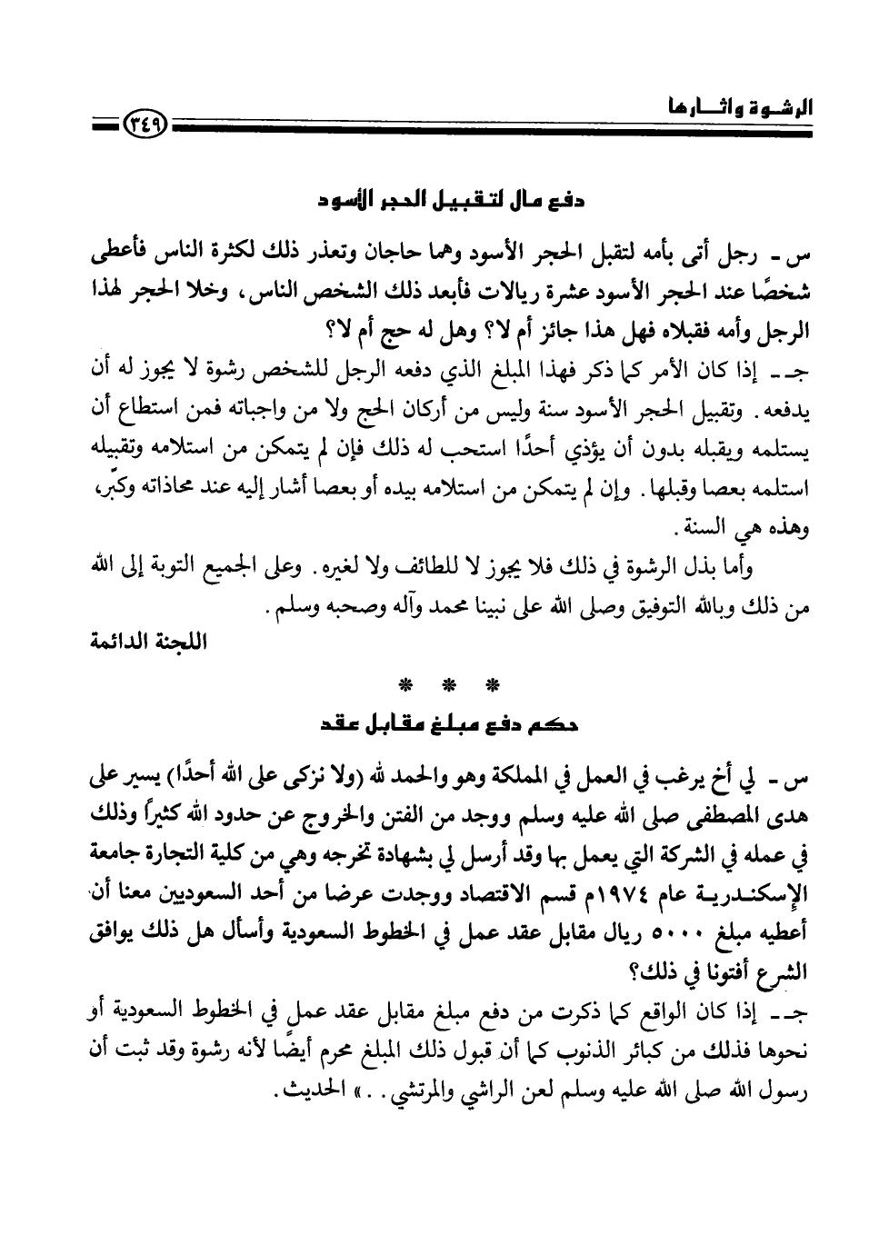 ج- إذا كان الأمر كما ذكر فهذا المبلغ الذي دفعه الرجل للشخص رشوة ولا يجوز له أن يستلمه ويقبله بدون أن يؤدي أحداً استجب له ذلك فإن لم يتمكن من استلامه وتقبيله استلمه بعصا وقبلها. وإن لم يتمكن من استلامه بيده أو بعصا أشار إليه عند محاذاته وكبر، وهذه هي السنة.