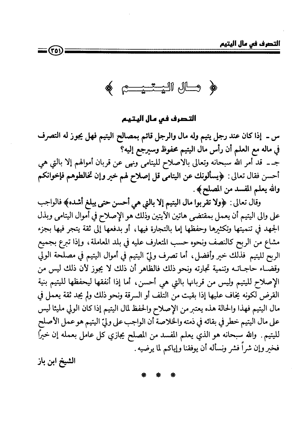 ج- قد أمر الله سبحانه وتعالى بالإصلاح لليتامي ونهى عن قربان أموالهم إلا بالتي هم أحسن فقال تعالى {يسألونك عن اليتامي قل إصلاح لهم خير وإن تخالظوهم فإخوانكم والله يعلم المفسد من المصلح} .