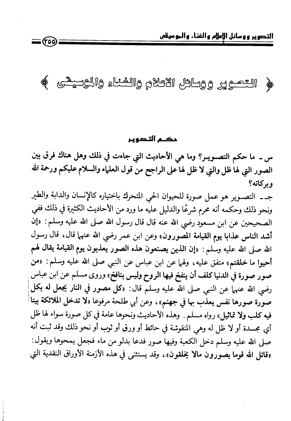 ج- التصوير هو عمل صورة للحيوان الحي المتحرك باختياره كالإنسان والدابة والطير ونحو ذلك وحكمه أنه محرم شرعاً والدليل عليه ما ورد من الأحاديث الكثيرة في ذلك ففي الصحيحين عن ابن مسعود رضي الله عنه قال قال رسول الله، - صلى الله عليه وسلم -، {إن أشد الناس عذابا يوم القيامة المصورون} وعن ابن عمر رضي الله عنهما قال، قال رسول الله، - صلى الله عليه وسلم -، {إن الذين يصنعون هذه الصور يعذبون يوم القيامة يقال لهم أحيوا ما خلقتم} متفق عليه. ولهما عن ابن عباس عن النبي، - صلى الله عليه وسلم -، {من صور صورة في الدنيا كلف أن ينفخ فيها الروح وليس بنافخ} وروى مسلم عن ابن عباس رضي الله عنهما عن النبي، - صلى الله عليه وسلم -، قال كل مصور في النار يجعل له بكل صورة صورها نفس نفس يعذب بها في جهنم} وعن أبي طلحة مرفوعاً {لا تدخل الملائكة بيتا فيه كلب أو تماثيل} رواه مسلم. وهذه الأحاديث ونحوها عامة في كل صورة سواء لها ظل أي مجسدة أو لا ظل له وهي المنقوشة في حائط أو ورق أو ثوب أو نحو ذلك وقد ثبت أنه، - صلى الله عليه وسلم -، دخل الكعبة وفيها صور فدعا بدلو من ماء فجعل يمحوها ويقول {قاتل الله قوما يصورون مالا يخلقون} وقد يستثنى في هذه الأزمنة الأوراق النقدية التي