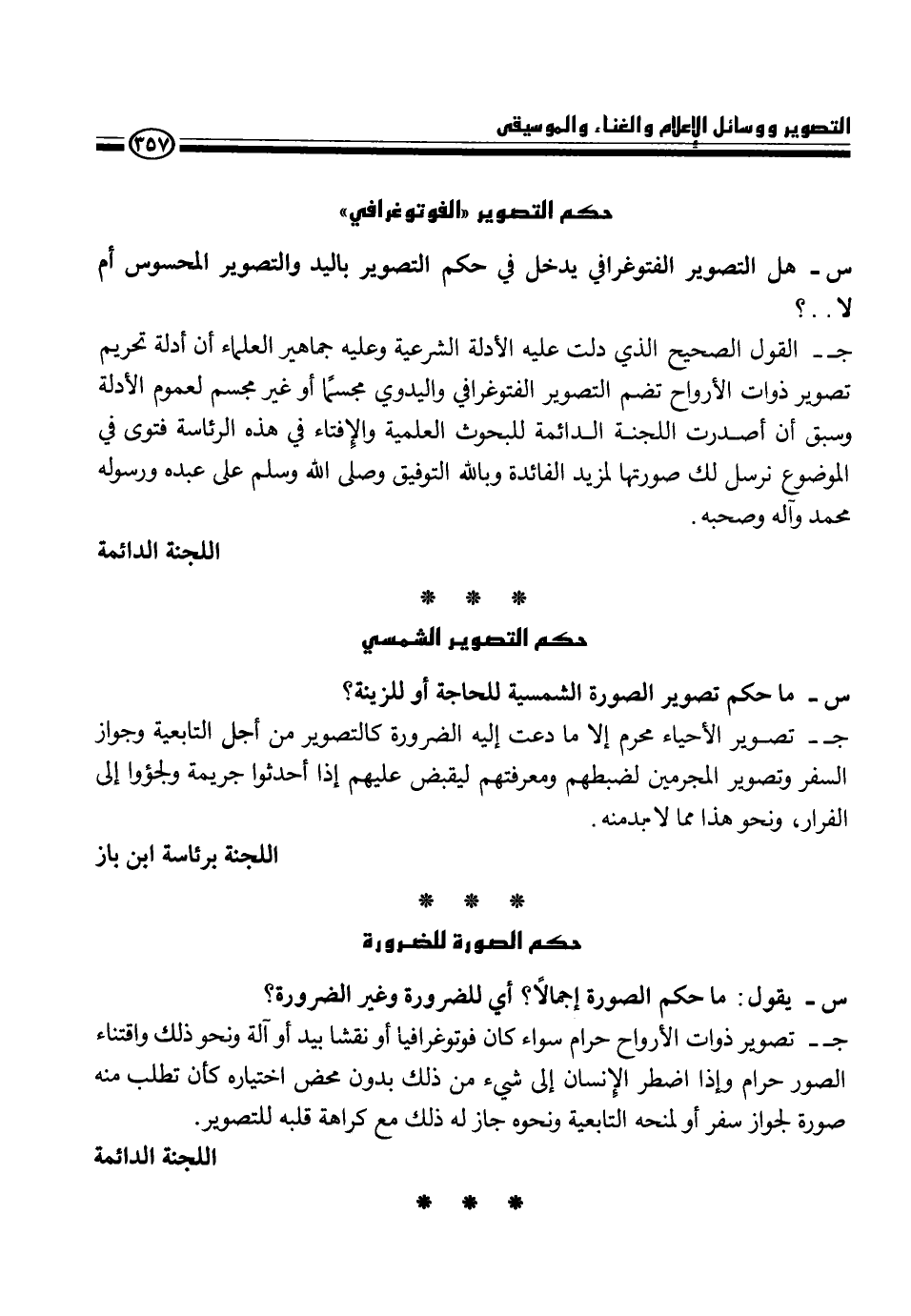 ج- القول الصحيح الذي دلت عليه الأدلة الشرعية وعليه جماهير العلماء أن أدلة تحريم تصوير ذوات الأرواح تضم التصوير الفتوغرافي واليدوي مجسماً أو غير مجسم لعموم الأدلة وسبق أن أصدرت اللجنة الدائمة للبحوث العلمية والإفتاء في هذه الرئاسة فتوى في الموضوع ترسل لك صورتها لمزيد الفائدة وبالله التوفيق وصلى الله وسلم على عبده ورسوله محمد وآله وصحبه.