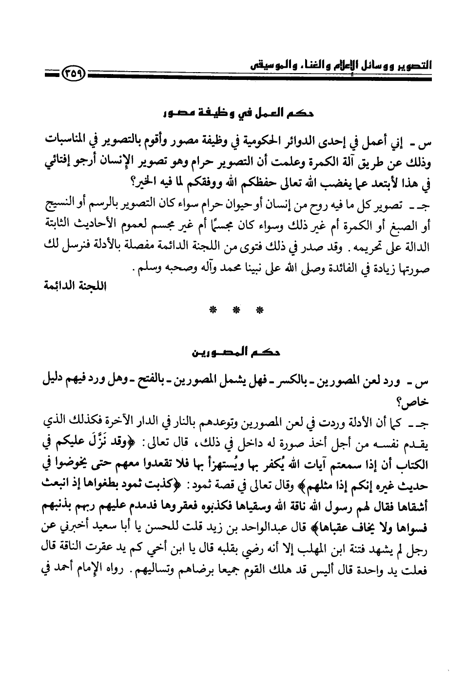 ج- كما أن الأدلة وردت في لعن المصورين وتوعدهم بالنار في الدار الآخرة فكذلك الذي يقدم نفسه من أجل أخذ صورة له داخل في ذلك، قال تعالى {وقد نزل عليكم في الكتاب أن إذا سمعتم آيات الله يكفر بها ويُستهزأ بها فلا تقعدوا معهم حتى يخوضوا في حديث غيره إنكم إذا مثلهم " وقال تعالى في قصة ثمود {كذبت ثمود بطغواها إذ انبعث أشقاها فقال لهم رسول الله ناقة الله وسقياها فكذبوه فعقروها فدمام عليهم ربهم بذنبهم فسواها ولا يخاف عقباها} قال عبد الواحد بن زيد قلت للحسمن يا أبا سعيد أخبرني عن رجل لم يشهد فتنة ابن اللهب إلا أنه رضي بقلبه قال يا ابن أخي كم يد عقرت الناقة قال فعلت يد واحدة قال أليس قد هلك القوم جميعاً برضاهم وتساليهم. رواه الإمام أحمد في