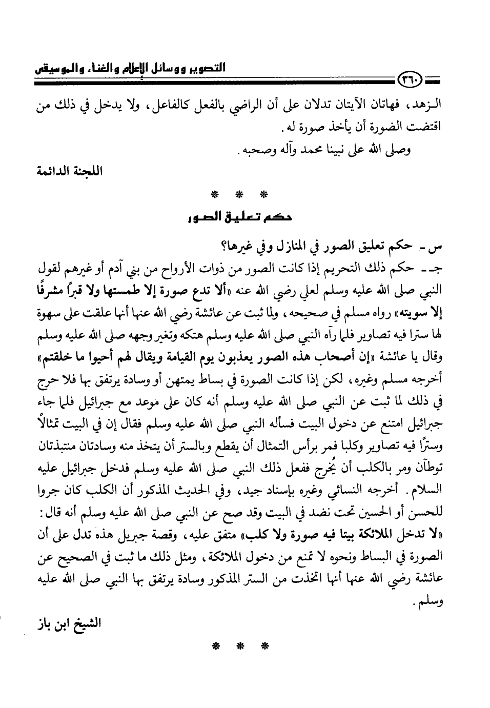 ج- حكم ذلك التحريم إذا كانت الصور من ذوات الأرواح من بني آدم أو غيرهم لقول النبي، - صلى الله عليه وسلم -، لعلي رضي الله عنه " ألا تدع صورة إلا طمستها ولا قبراً مشرفاً إلا سويته " رواه مسلم في صحيحه، ولما ثبت عن عائشة رضي الله عنها أنها علقت على سهوة لها ستراً فيه تصاوير فلما رآه النبي، - صلى الله عليه وسلم -، هتكه وتغير وجهه صلى الله عليه وسلم وقال يا عائشة {إن أصحاب هذه الصور يعذبون يوم القيامة ويقال لهم أحيوا ما خلقتم} أخرجه مسلم وغيره، لكن إذا كانت الصورة في بساط يمتهن أو وسادة يرتفق بها فلا حرج في ذلك لما ثبت عن النبي، - صلى الله عليه وسلم -، أنه كان على موعد مع جبرائيل فلما جاء جبرائيل امتنع عن دخول البيت فسأله النبي، - صلى الله عليه وسلم -، فقال إن في البيت تمثالاً وستراً فيه تصاوير وكلبا فمر برأس التمثال أن يقطع وبالستر أن يتخذ منه وسادتان منتبذتان توطآن ومر بالكلب أن يخرج ففعل ذلك النبي، - صلى الله عليه وسلم -، فدخل جبرائيل عليه السلام. أخرجه النسائي وغيره بإسناد جيد، وفي الحديث المذكور أن الكلب كان جروا للحسن أو الحسين تحت نضد في البيت وقد صح عن النبي، - صلى الله عليه وسلم -، أنه قال {لا تدخل الملائكة بيتا فيه صور ولا كلب} متفق عليه، وقصة جبريل هذه تدل على أن الصورة في البساط ونحوه لاتمنع من دخول الملائكة، ومثل ذلك ما ثبت في الصحيح عن عائشة رضي الله عنها أنها أخذت من الستر المذكور وسادة يرتفق بها النبي، - صلى الله عليه وسلم -،.
