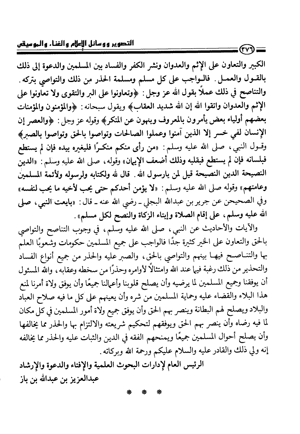 والآيات والأحاديث عن النبي، - صلى الله عليه وسلم -، في وجوب التناصح والتواصي بالحق والتعاون على الخير كثيرة جداً فالواجب على جميع المسلمين حكومات وشعوباً العلم بها والتناصح فيها بينهم والتواصي بالحق، والصبر عليه والحذر من جميع أنواع الفساد والتحذير من ذلك رغبة فميا عند الله وامتثالاً لأوامره وحذارً من سخطه وعقابه، والله المسئول أن يوفقنا وجميع المسلمين لما يرضيه وأن يصلح قلوبنا وأعمالنا جميعاً وأن يوفق ولاة أمرنا لمنع هذا البلاء والقضاء عليه وحماية المسلمين من شره وأن يعينهم على كل ما فيه صلاح العباد والبلاد ويصلح لهم البطانة وينصر بهم الحق وأن يوفق جميع ولاة أمور المسلمين في كل مكان لما فيه رضاه وأن ينصر بهم الحق ويوفقهم لتحيكم شريعته والالتزام بها والحذر مما يخالفها وأن يصلح أحوال المسلمين جميعاً ويمنحهم الفقه في الدين والثبات عليه والحذر مما يخالفه إنه ولي ذلك والقادر عليه والسلام عليكم ورحمة الله وبركاته.