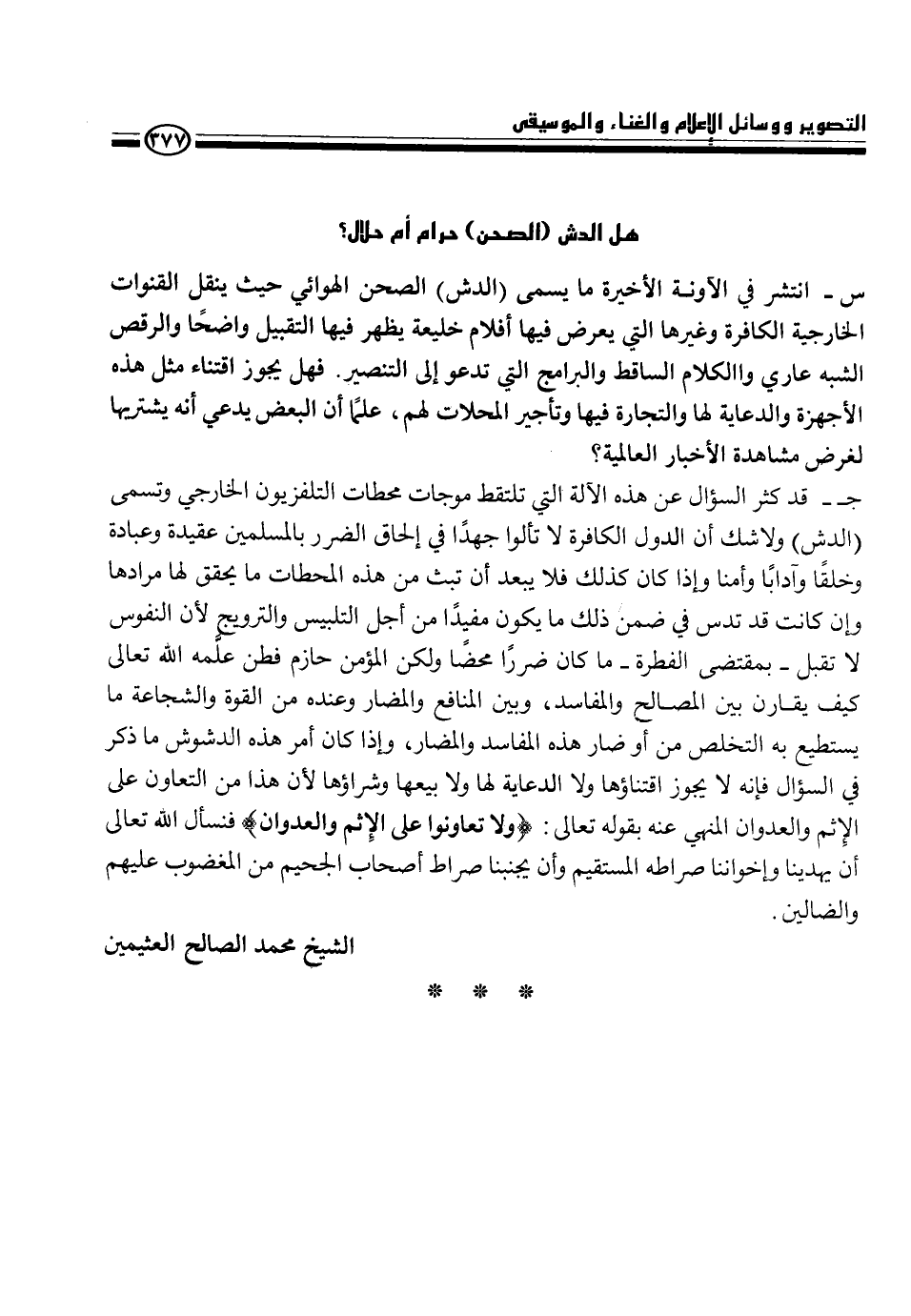 ج- قد كثر السؤال عن هذه الآلة التي تلتقط موجات محطات التليفزيون الخارجي وتسمى (الدش) ولا شك أن الدول الكافرة لا تألوا جهداً في إلحاق الضرر بالمسلمين عقيدة وعبادة وخلقاً وآداباً وأمنا وإذا كان كذلك فلا يبعد أن تبث من هذه المحطات ما يحقق لها مرادها وإن كانت قد تدس في ضمن ذلك ما يكون مفيداً من أجل التلبيس والترويج لأن النفوس لا تقبل - بمقتضى الفطرة - ما كان ضرراً محضاً ولكن المؤمن حازم فطن علمه الله تعالى كيف يقارن بين المصالح والمفاسد، وبين المنافع والمضار وعنده من القوة والشجاعة ما يستطيع به التخلص من أوضار هذه المفساد والمضار، وإذا كان أمر هذه الدشوش ما ذكر في السؤال فإنه لا يجوز اقتناؤها ولا الدعاية لها ولا بيعها وشراؤها لأن هذا من التعاون على الإثم والعدوان المنهي عنه بقول الله تعالى {ولا تعاونوا على الإثم والعدوان} فنسأل الله تعالى أن يهدينا وإخواننا صراطه المستقيم وأن يجنبنا صراط أصحاب الجحيم من المغضوب عليهم والضالين.
