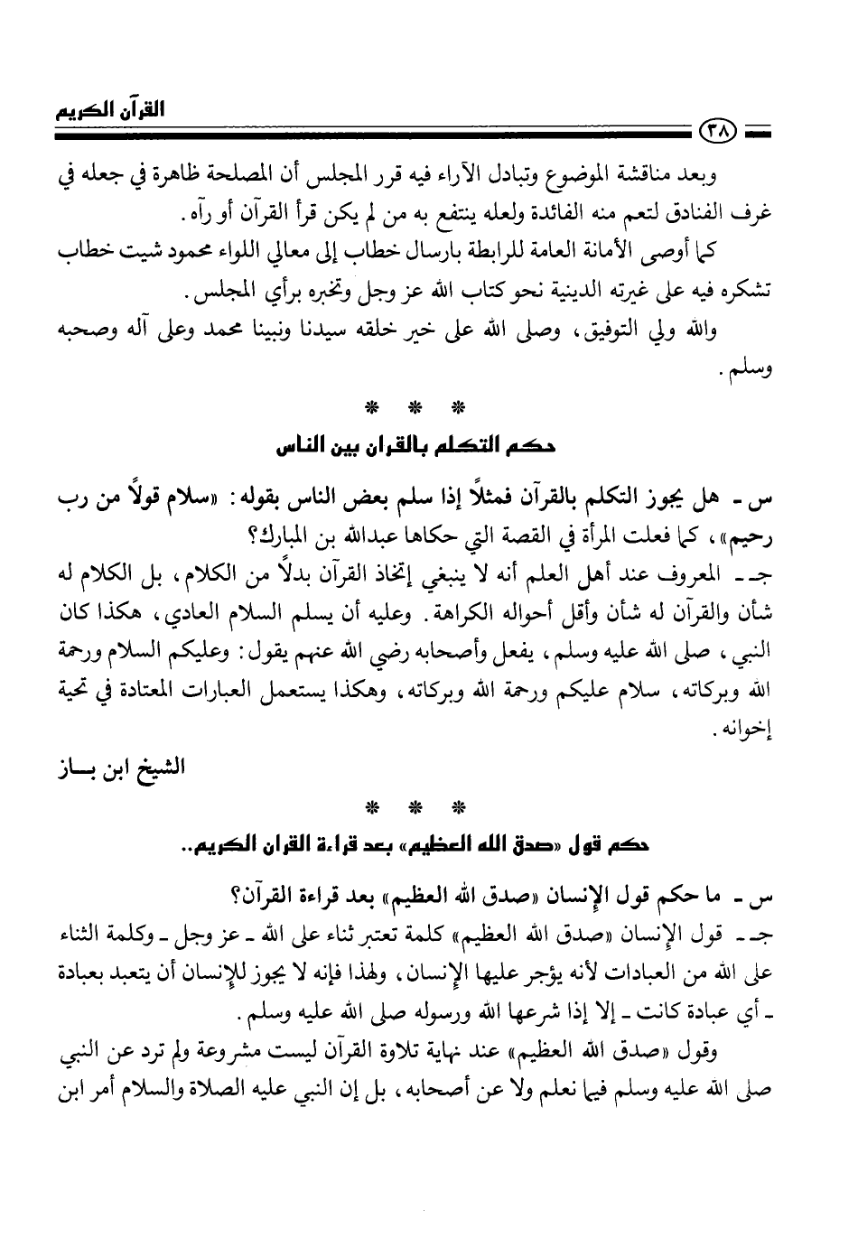 وبعد مناقشة الموضوع وتبادل الآراء فيه قرر المجلس أن المصلحة ظاهرة في جعله في غرف الفنادق لنعم منه الفائدة ولعله ينتفع به من لم يكن قرأ القرآن أو رآه.