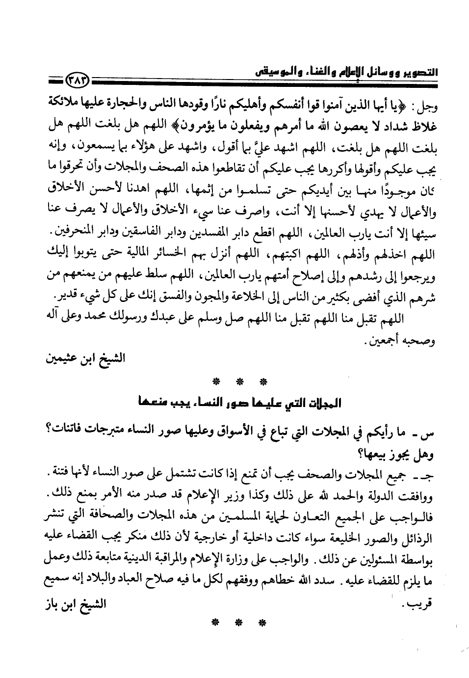 ج- جميع المجلات والصحف يجب أن تمنع إذا كات تشتمل على صور النساء لأنها فتنة. ووافقت الدولة والحمد لله على ذلك وكذا وزير الإعلام قد صدر منه الأمر يمنع ذلك. فالواجب على الجميع التعاون لحماية المسلمين من هذه المجلات والصحافة التي تنشر الرذائل والصور الخليعة سواء كانت داخلية أو خارجية لأن ذلك منكر يجب القضاء عليه بواسطة المسؤولين عن ذلك. والواجب على وزارة الإعلام والمراقبة الدينية متابعة ذلك وعمل ما يلزم للقضاء عليه. سداد الله خطاهم ووفقهم لكل من فيه صلاح العباد والبلاد إنه سميع قريب.