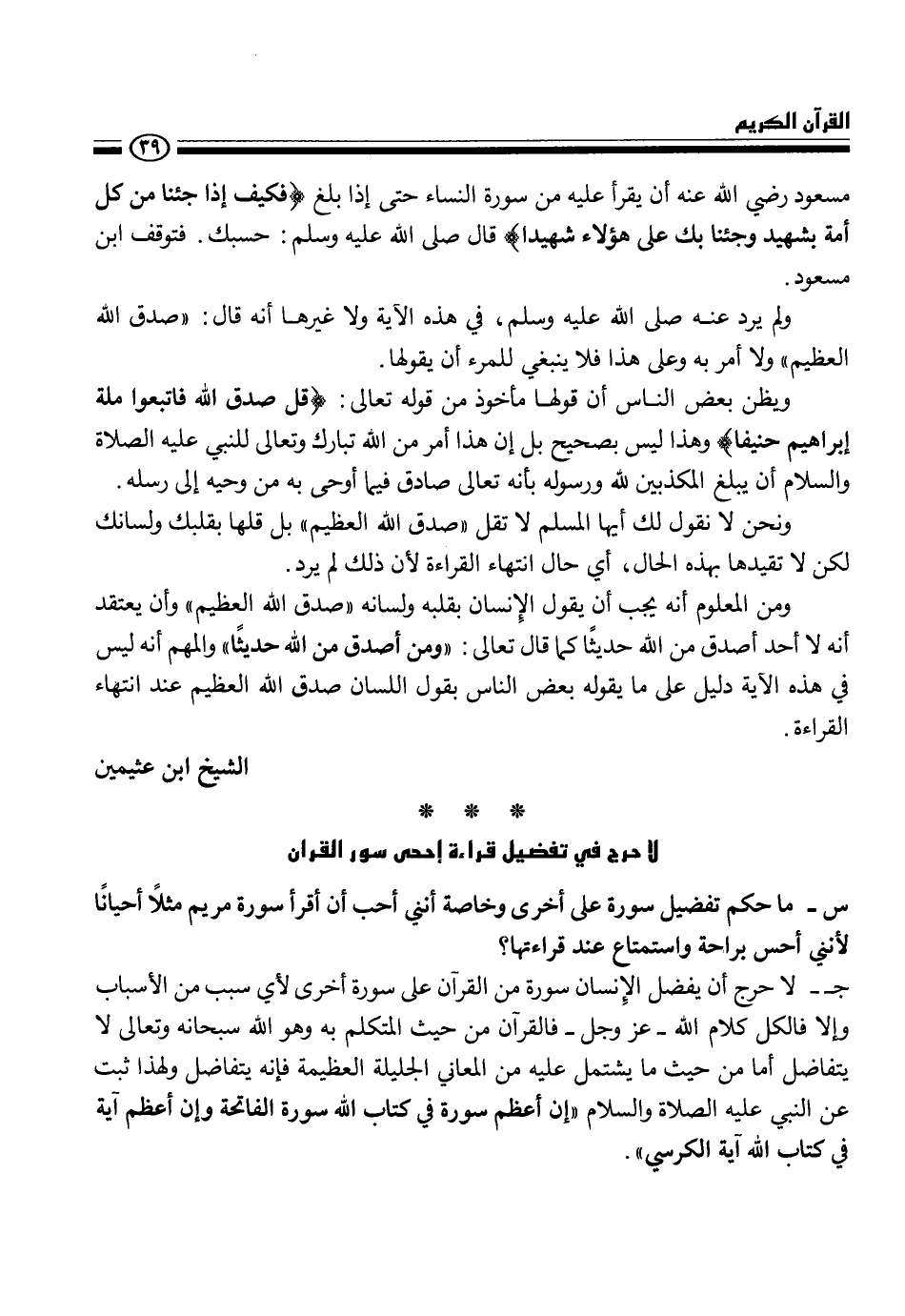لا حرج في تفضيل قراءة أحدى سور القرآن