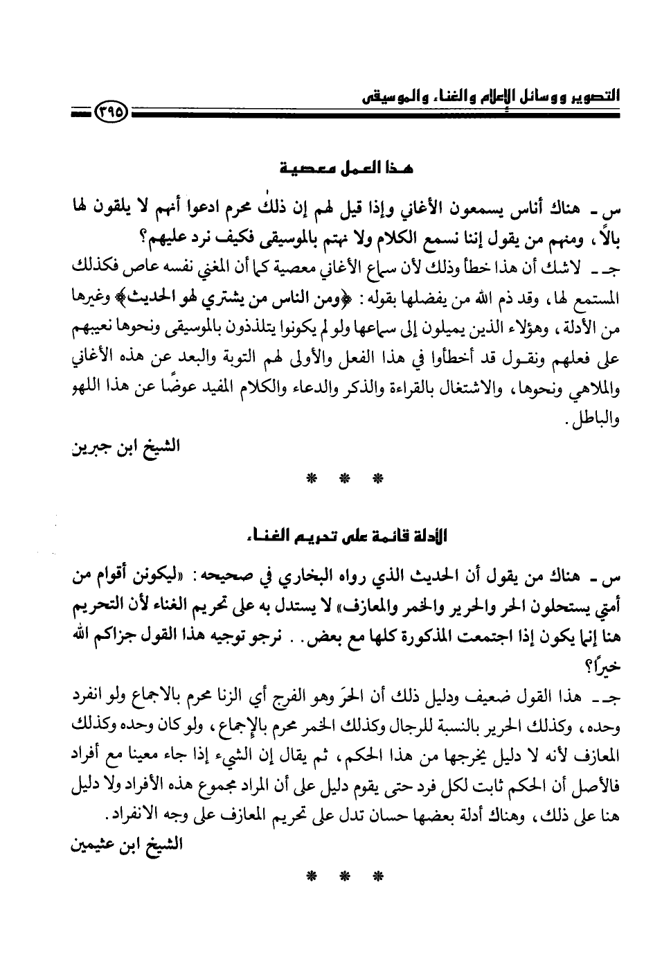 ج- هذا القول ضعيف ودليل ذلك أن الحر وهو الفرج أي الزنا محرم بالإجماع ولوانفرد وحده، وكذلك الحرير بالنسبة للرجل وكذلك الخمر محرم بالإجماع، ولو كان وحده وكذلك المعازف لأن ذلك دليل يخرجها من هذا الحكم، ثم يقال إن الشيء إذا جاء معينا مع أفراد فالاصل أن الحكم ثابت لكل فرد حتى يقوم دليل على أن المراد مجموع هذه الأفراد ولا دليل هنا على ذلك، وهناك أدلة بعضها حسان تدل على تحريم المعازف على وجه الانفراد.