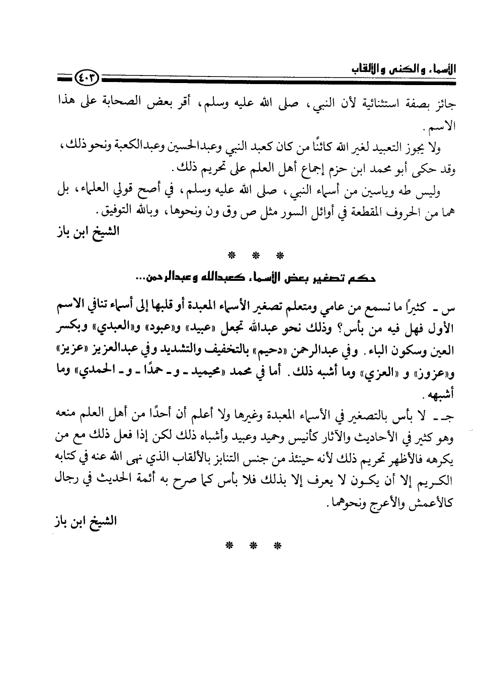 س - كثيراً ما نسمع من عامي ومتعلم تصغير الأسماء المعبدة أو قلبها إلى أسماء تنافي الاسم الأول فهل فيه بأس؟ وذلك نحو عبد الله ونحو عبد الله تجعل " عبيد " و " عبود " والعبدي " وبكسر العين وسكون الباء، وفي عبد الرحمن " دحيم " بالتخفيف والتشديد وفي عبد العزيز " عزيز" و" عزوز " والعزي" وما أشبه ذلك. أما في محمد " محيميد - و - حمداً والحمدي وما أشبه.