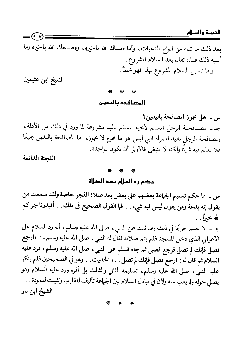 س - ما حكم تسليم الجماعة بعضهم على بعض بعد صلاة الفجر خاصة ولقد سمعت من يقول إنه بدعة ومن يقول ليس فيه شي.. فما القول الصحيح في ذلك.. أفيدونا جزاكم الله خيراً.