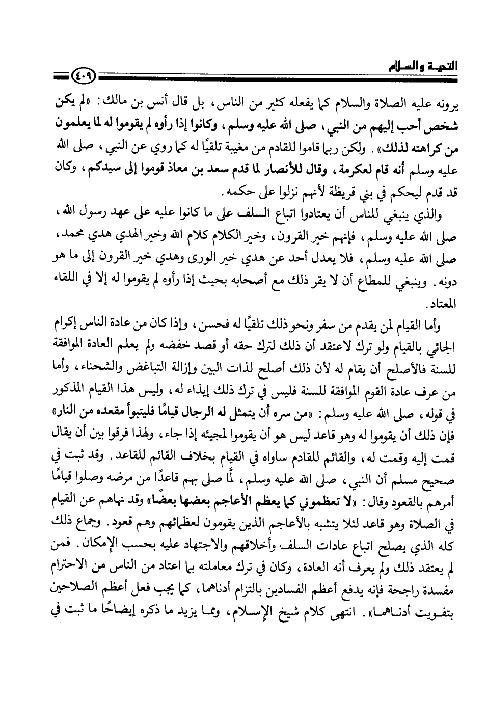 والذي ينبغي للناس أن يعتادوا اتباع السلف على ما كانوا عليه على عهد رسول الله، - صلى الله عليه وسلم -، فإنهم خير القرون، وخير الكلام كلام الله وخير الهدى هدى محمد، - صلى الله عليه وسلم -، فلا يعدل شأحد عن هدي خير الورى وهدي خير القرون إلى ما هو دونه. وينبغي للمطاع أن لا يقر ذلك مع أصحابه بحيث إذا رأوه لم يقوموا له إلا في اللقاء المعتاد.